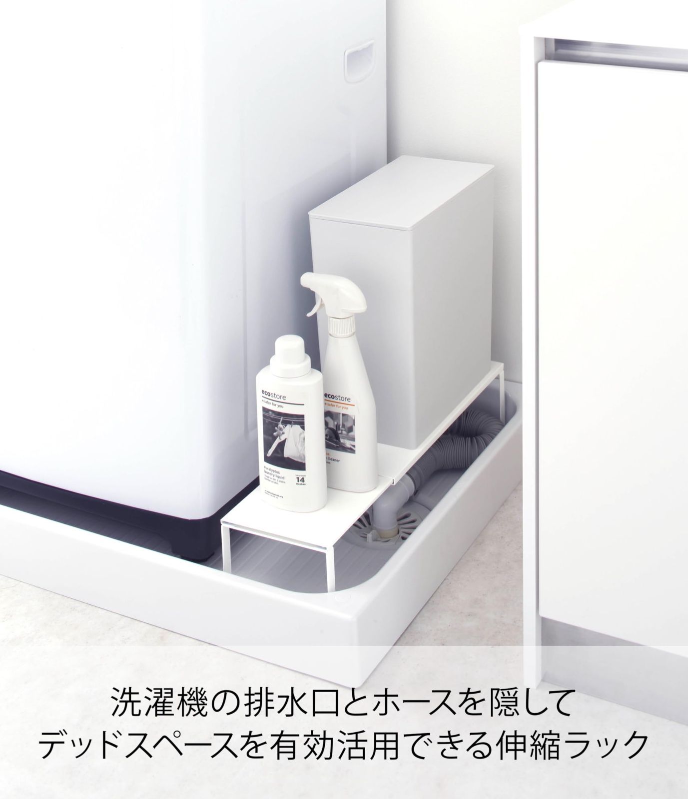 洗濯機の排水口とホースを隠しながら、その上を有効活用できる伸縮ラック。