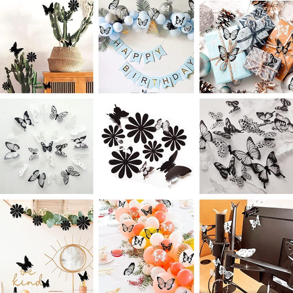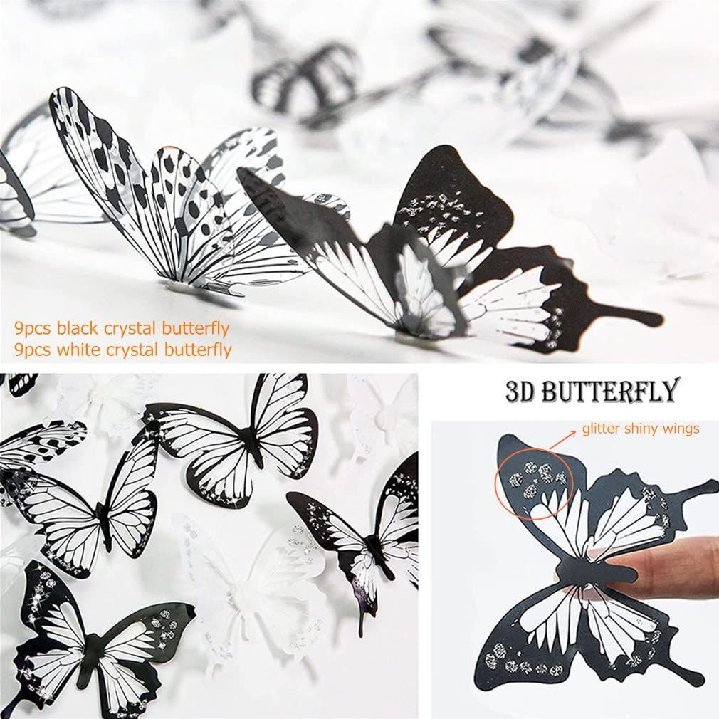 【シャイニー&クリスタルバタフライ】:キラキラと輝く翼とクリスタルのような効果を持つ18個の3D白黒バタフライがあります。それらは調整可能で、折りたたむことができるので、すべてが本物のように鮮やかになります。 4.5cmから7.5cmまでのさまざまなサイズ。