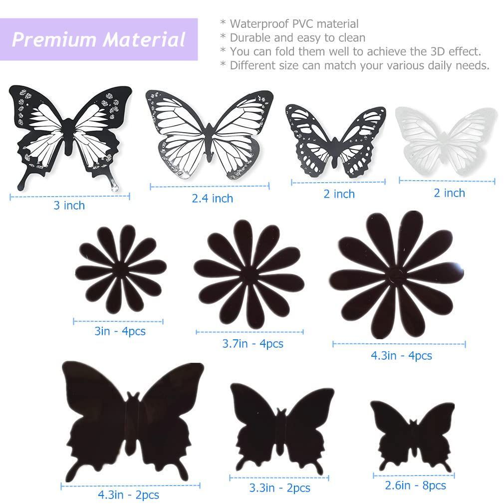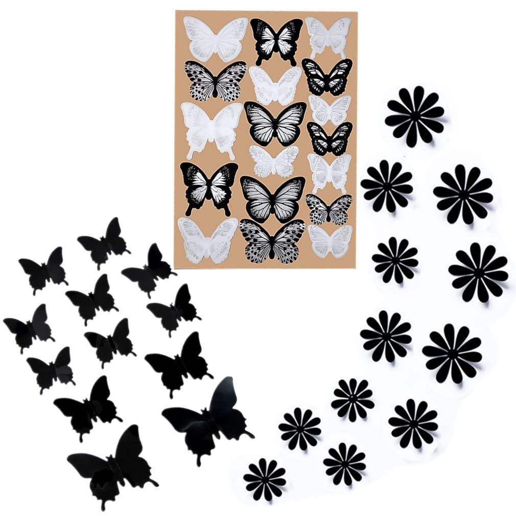 RuiChy 42個 蝶 花 ウォールステッカー、取り外し可能 3D立体 蝶 壁の装飾アート壁画 、接着剤 蝶型 ひまわり 貼り紙 と スティッキードット にとって 冷蔵庫 部屋飾り パーティ 結婚式の装飾(黒、白)