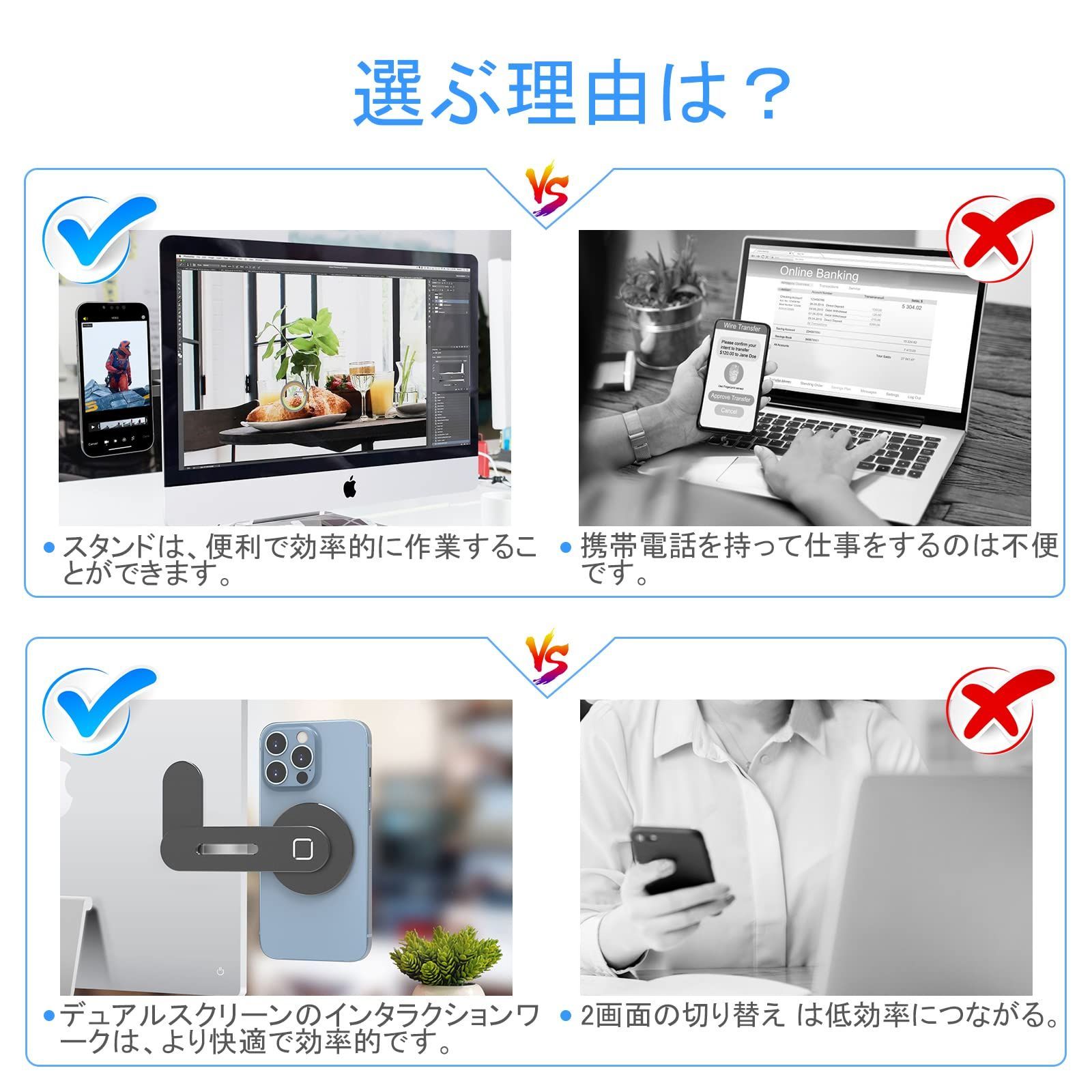 【優れた互換性】スマホ パソコン 固定 スタンドですはiPhone 1216シリーズ、MagSafeアクセサリに対応しており、iPhone、Samsung、Google製品との互換性も確保しています。さらに、付属の金属プレートにより、他のスマートフォンにも対応し、幅広い機器での使用が可能です。