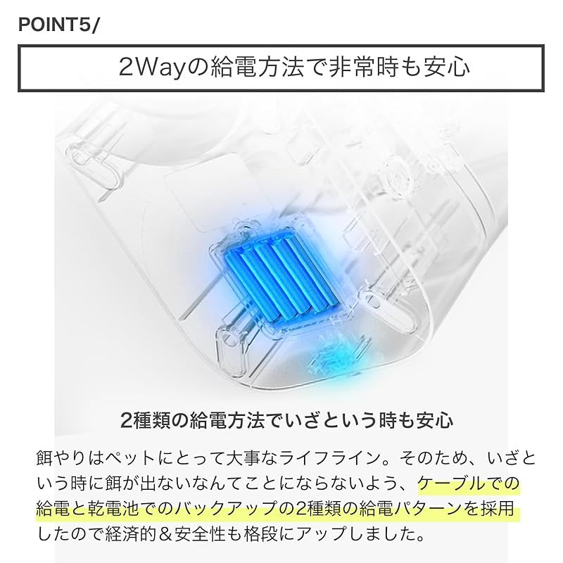 【給餌量の設定】 10グラム刻みで10g、20g、30g、40g、50gの5段階でフードの量を設定することができます。 食事だけでなく、おやつとして少量上げるのにも最適です。 また給餌の回数も最大10回に設定することができるので、生活リズムに合わせて柔軟に対応可能です。