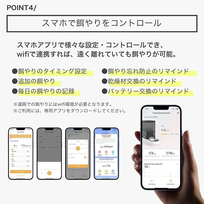 【スマホでのコントロール】 スマホアプリと連携すれば様々な設定・コントロールが可能となります。 ・エサやりのタイミングの設定 ・追加のエサやり ・エサやりのリマインド ・乾燥剤交換のリマインド ・バッテリー交換のリマインドなどが設定できます。