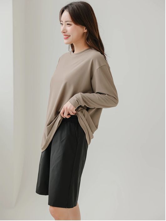 シンプル無地のダークカーキがトレンド感抜群で、大人カジュアルな水着スタイルに。