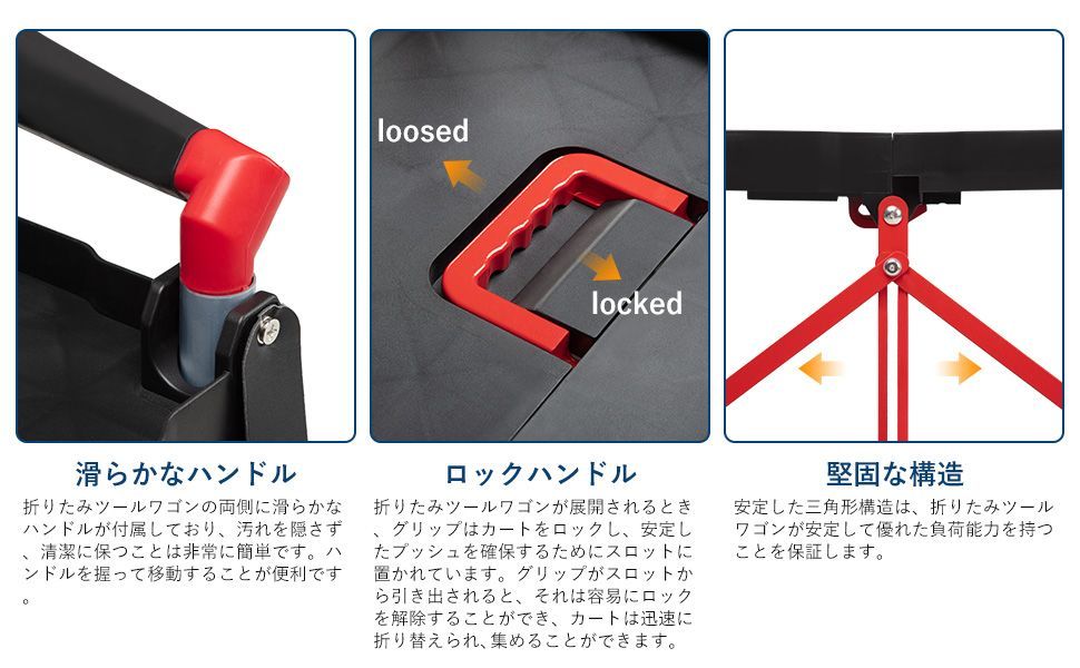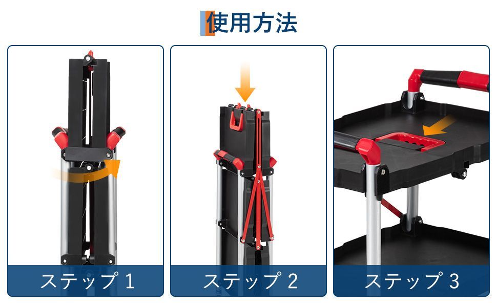【簡単操作、手軽に使える構造】「ハンドルを引き上げて折り畳む→ 広げてロック」のシンプル操作! 組み立て不要で即戦力,左右対称の持ち手も使いやすく、高齢者や女性でも軽快に運用できます。