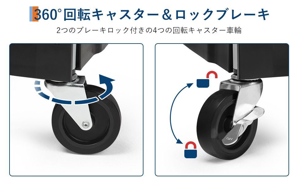 【安定ロック機構と頑丈フレーム】押す際の安定性を追求! ロック装置で不用意な移動を防ぎ、大型キャスター ×4 + ブレーキ ×2 で滑らかな移動と確実な停止を実現。頑丈な金属フレームで、総耐荷重 75kg(棚 1 枚あたり 25kg)の重みにも対応。