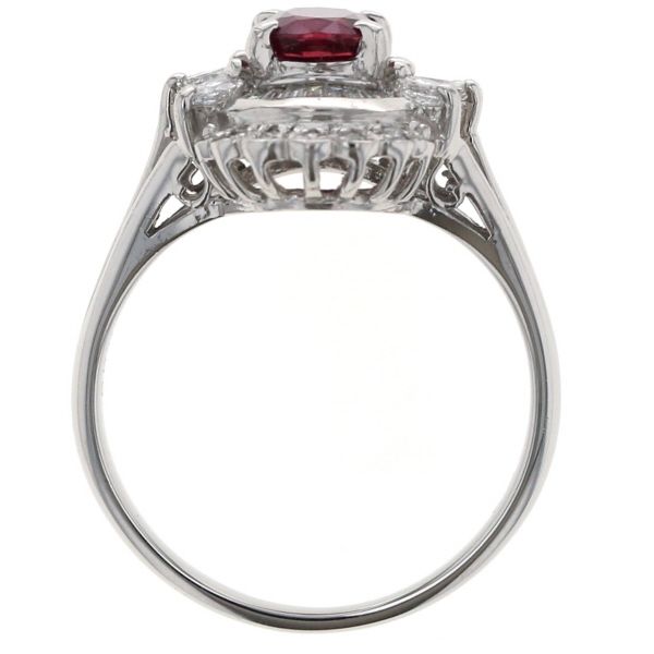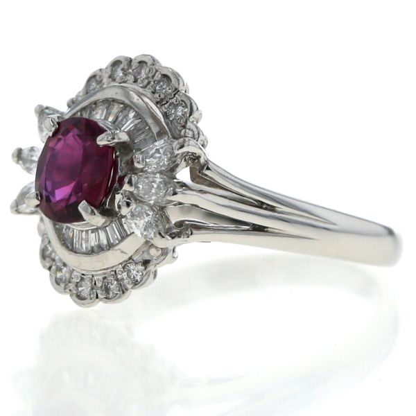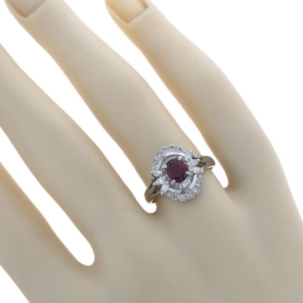 【商品紹介】プラチナを使用した、優雅で華やかなデザインのリングです。中央には、深く鮮やかな赤色が目を引くルビーがオーバルカットでセットされており、このルビーは、ダイヤモンドによる豪華な2重の取り巻きデザインで囲まれて、圧倒的な存在感を放ちます。内側の取り巻きは、ルビーの上下に繊細なバゲットカットのダイヤモンドが弧を描くように配され、外側の取り巻きは、花びらのようなマーキスカットとラウンドカットのダイヤモンドが、スカラップ状の美しい縁取りを形成しています。プラチナの清らかな輝きと、ルビーの情熱的な赤、そして多様なカットのダイヤモンドの煌めきが調和した、エレガントで個性的なジュエリーです。指元に強い華やかさを添える逸品です。