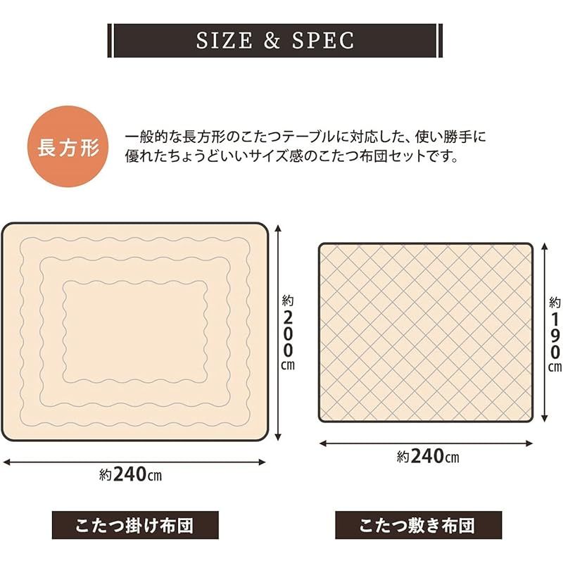 【サイズ】<長方形>こたつ掛け布団:約240×200cm/こたつ敷き布団:約240×190cm 【こたつ掛け布団】表地:ポリエステル100%(280g/m2 ロングパイルフランネル8mm エムールヒートプラス使用)/中材:ポリエステル100%/裏面:ポリエステル100%(マイクロフリース)