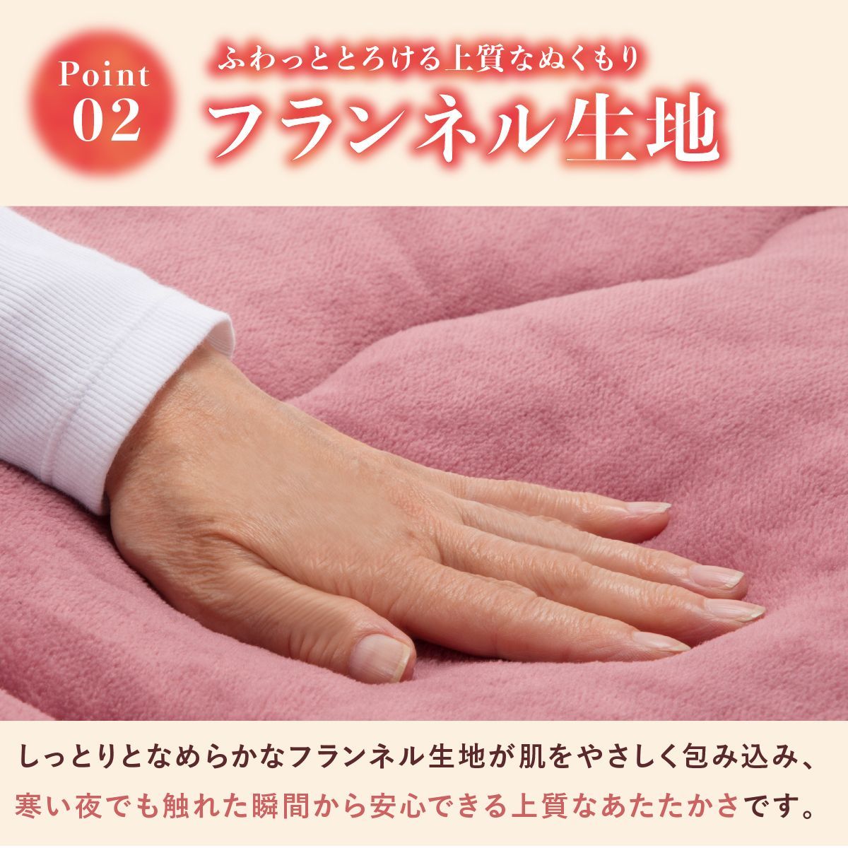 触れた瞬間からあたたかく、寝返りのたびに心地よさを感じるやわらかな素材。