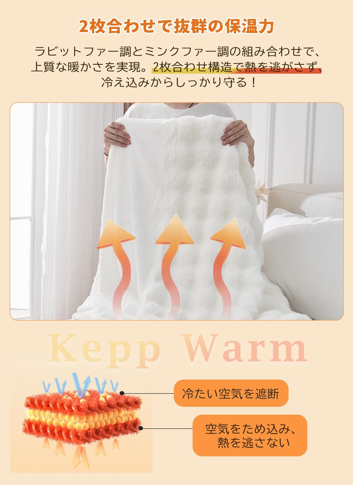 【2枚合わせ構造が叶える優れた保温力】二重構造により空気の層を閉じ込め、一般的な毛布に比べて高い保温性を実現。1枚でも十分な暖かさを感じられ、掛け布団と合わせることでさらにぬくもりアップ。寒い冬の夜も快適に眠れる厚手の冬用ブランケットです。