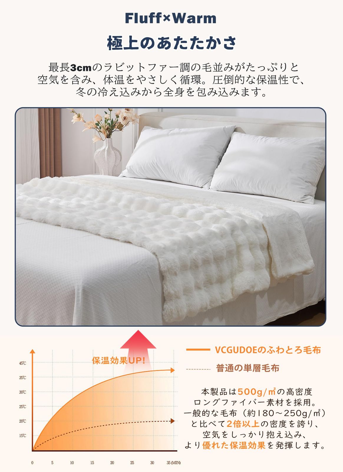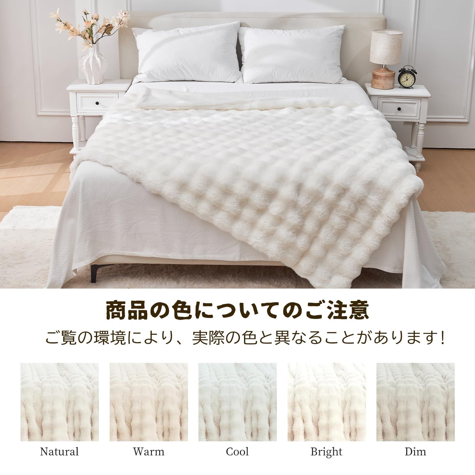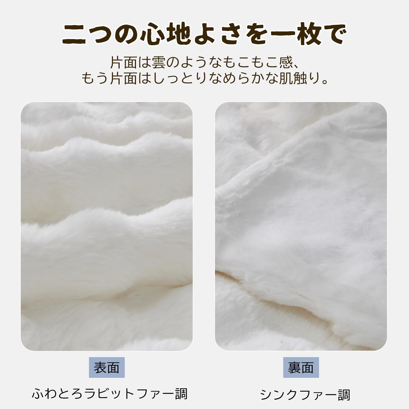 【とろけるような極上の肌触り】 表面には500gsmのラビットファー調フェイクファー、裏面には230gsmのプラッシュ素材を採用。ふわふわ、とろとろの感触はまるで雲に包まれているかのような心地よさ。お子様から大人まで安心して使える低ホルム仕様で、やさしく肌を包み込みます。