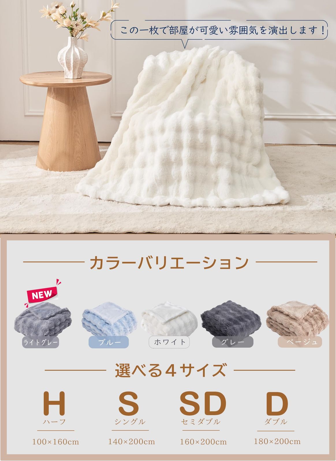 【おしゃれで高級感のあるデザイン】立体的なもこもこデザインが特徴で、インテリアのアクセントにもぴったり。シンプルながら高級感を兼ね備えたブランケットは、ご自宅用はもちろん、新築祝いやクリスマスプレゼントとしても喜ばれます。高精度な縫製と二重ロック縁仕様により、ほつれにくく長持ち。さらに静電気防止加工を施しており、冬場のパチッとした不快感やホコリの付着を軽減。日常使いに配慮した安心設計です。