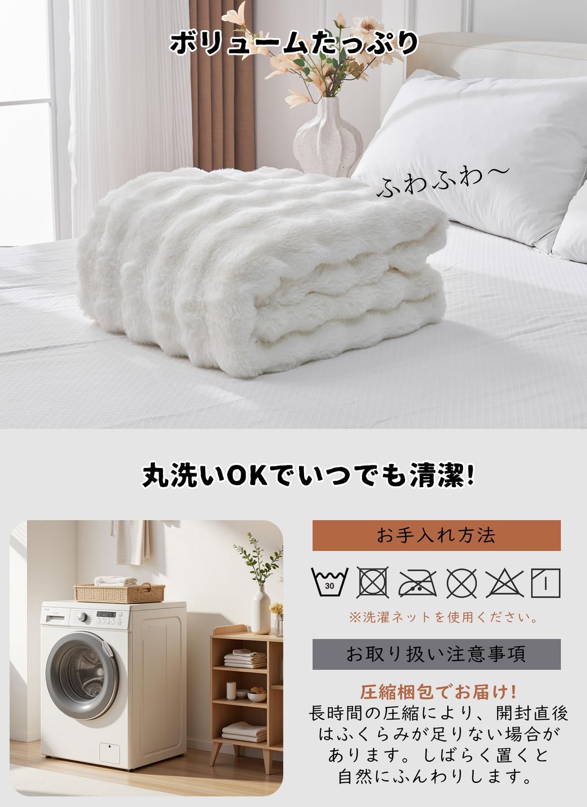 【お手入れ簡単&長持ち仕様】家庭用洗濯機で丸洗い可能なウォッシャブル仕様。縮みにくく毛玉や色落ちも起きにくいため、繰り返し洗ってもふわふわ感が長続き。お子様やペットがいるご家庭でも安心してお使いいただけ、いつでも清潔で快適な毛布を楽しめます。