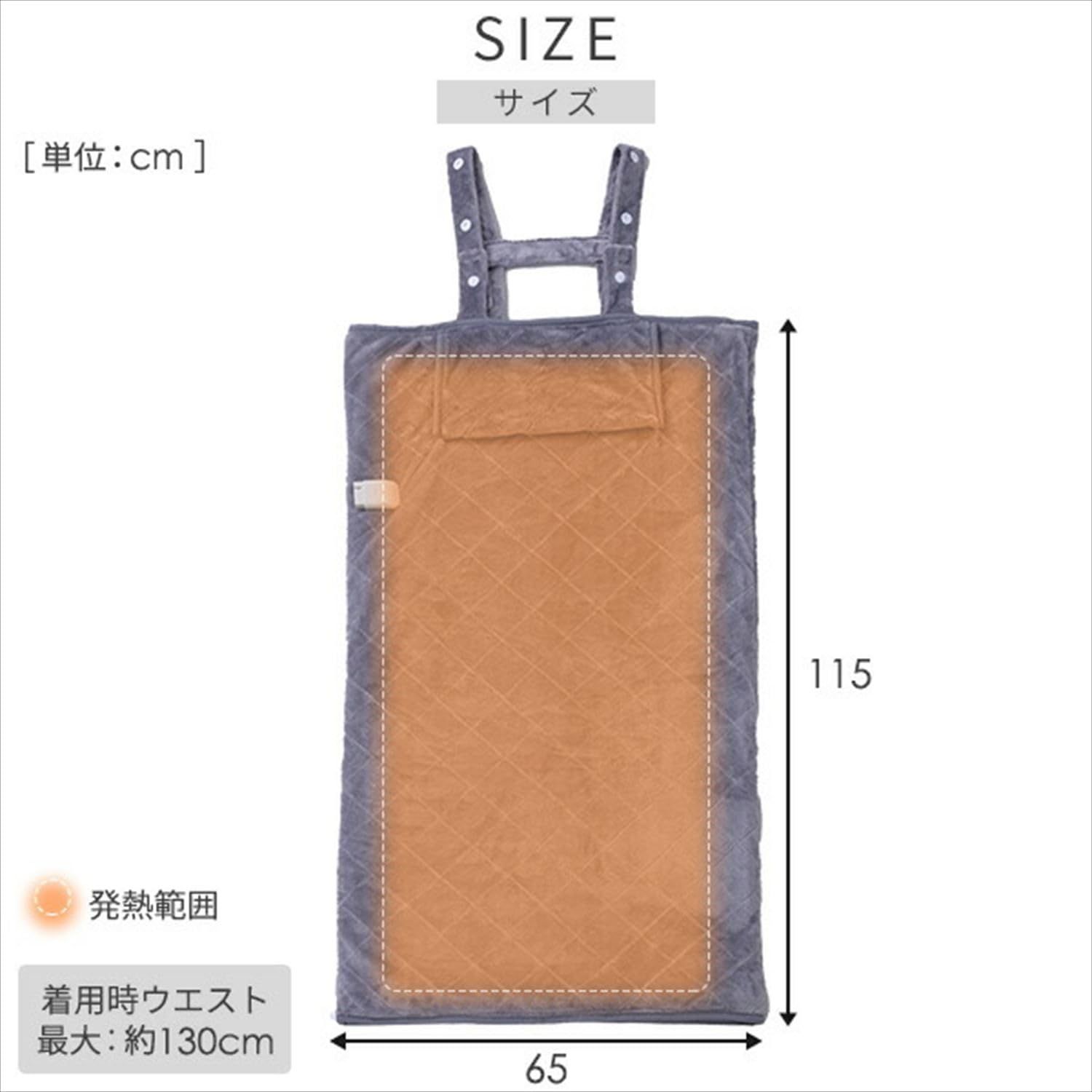 【まるでコタツな電気毛布】コタツにくるまれているような気分になれる電気着る毛布「くるみケット」がさらに快適に、動きやすくなって新登場。身長目安は150~180cmなので女性でも男性でもお使いいただけます。「着る」のはもちろん、広げればひざ掛けや掛敷毛布としても使え、手や小物を入れられる胸ポケットに底冷え対策になる足入れポケットなどもついて寒い冬にぴったりのアイテムです。さらに、毛布本体は洗濯機で丸洗い可能なので、いつでも清潔に気持ちよくお使いいただけます。【進化ポイント】1アジャスターのボタンが大きくなってより簡単に長さ調節できるようになりました。2肩ヒモの背中側をH型にしたことで、なで肩の方でもずり落ちる心配がなくなりました。3リモコン収納ポケットを追加しました。4足ポケットがマチ付きになって足が入れやすくなりました。5ファスナーで調節できるスリットが付いてさらに歩きやすくなりました。【省エネ】ヒーターやコタツと違い、ひとりだけあたためるアイテムなので省エネで経済的です。電気代は1日8時間使用した場合約6.4円で1ヶ月だと約192円とお財布にやさしく、気軽にお使いいただけます。【温度調節&タイマー】お好みに合わせて弱から強まで無段階で調節できます。その日の気温や体調に合わせて、お好みで調節してください。また、高温でダニを退治するダニ対策機能付きでアレルギーやぜんそくの原因にもなるダニをしっかり退治します。2時間オフタイマーと8時間オートオフタイマー機能搭載であたためすぎや切り忘れの心配もありません。【商品仕様】▪本体サイズ:115×65cm(着用時ウエスト最大約130cm)▪適応身長目安:150~180cm▪電源:交流100V(50/60Hz)▪消費電力:40W▪電源コードの長さ:電源側=1.96m/本体側=0.65m▪消費電力量:強=約27Wh/適温=約18Wh/弱=約13Wh▪1時間あたりの電気代:強=約0.8円/適温=約0.6円/弱=約0.4円(室温15℃、綿ふとん中で5時間運転したときの平均消費電力量を1KWh=31円で算出)▪表面温度:強=約53度/適温=約33度/弱=約23度▪自動オフ:2時間オフタイマー/8時間自動オフ▪保証期間:お買い上げ日より1年間(保証の範囲については、保証書をご確認ください。(一般家庭用以外(業務用など)に使用された場合の故障及び損傷などは保証対象外となります))
