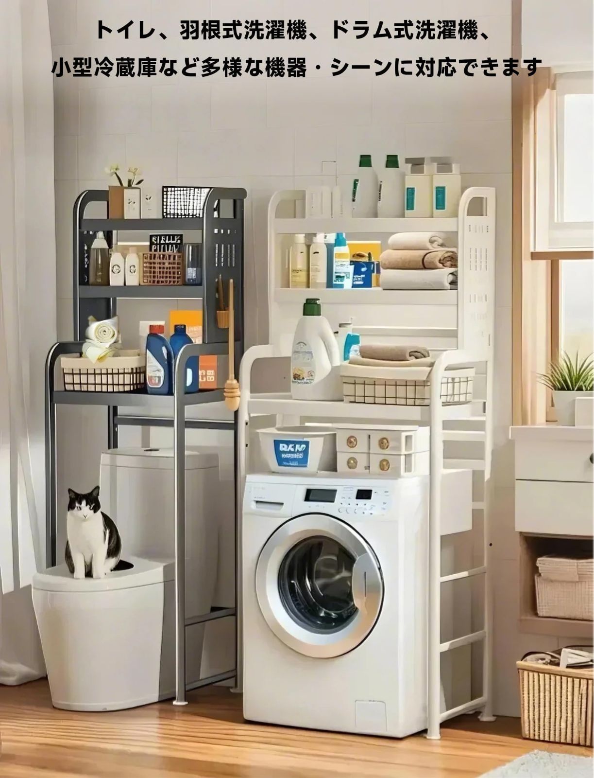 【伸縮可能なデザイン、幅広い応用】 この洗濯機用収納棚は、伸縮可能なデザインを採用しており、横方向の伸縮調整範囲は 51~81 センチメートルに達しており、垂直方向の高さは 157 センチメートル、171 センチメートルまたは 185 センチメートルに自由に切り替えることができます。様々なサイズの洗濯機に柔軟に対応することができ、ドラム式洗濯機であれ、タンブラー式洗濯機であれ、どちらにも適合させることができます。また、トイレの上の物置き棚として、ゴミ箱の上の物置き棚として、さらには小型冷蔵庫の上の物置き棚としても使用することができます。