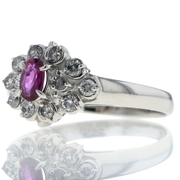 【商品紹介】オーバルカットのルビーを取り巻きで仕立てたプラチナリングです。深い赤色を湛えたルビーの周囲を、小粒ながら光の強いダイヤが均一に囲み、主石の存在感を際立たせます。