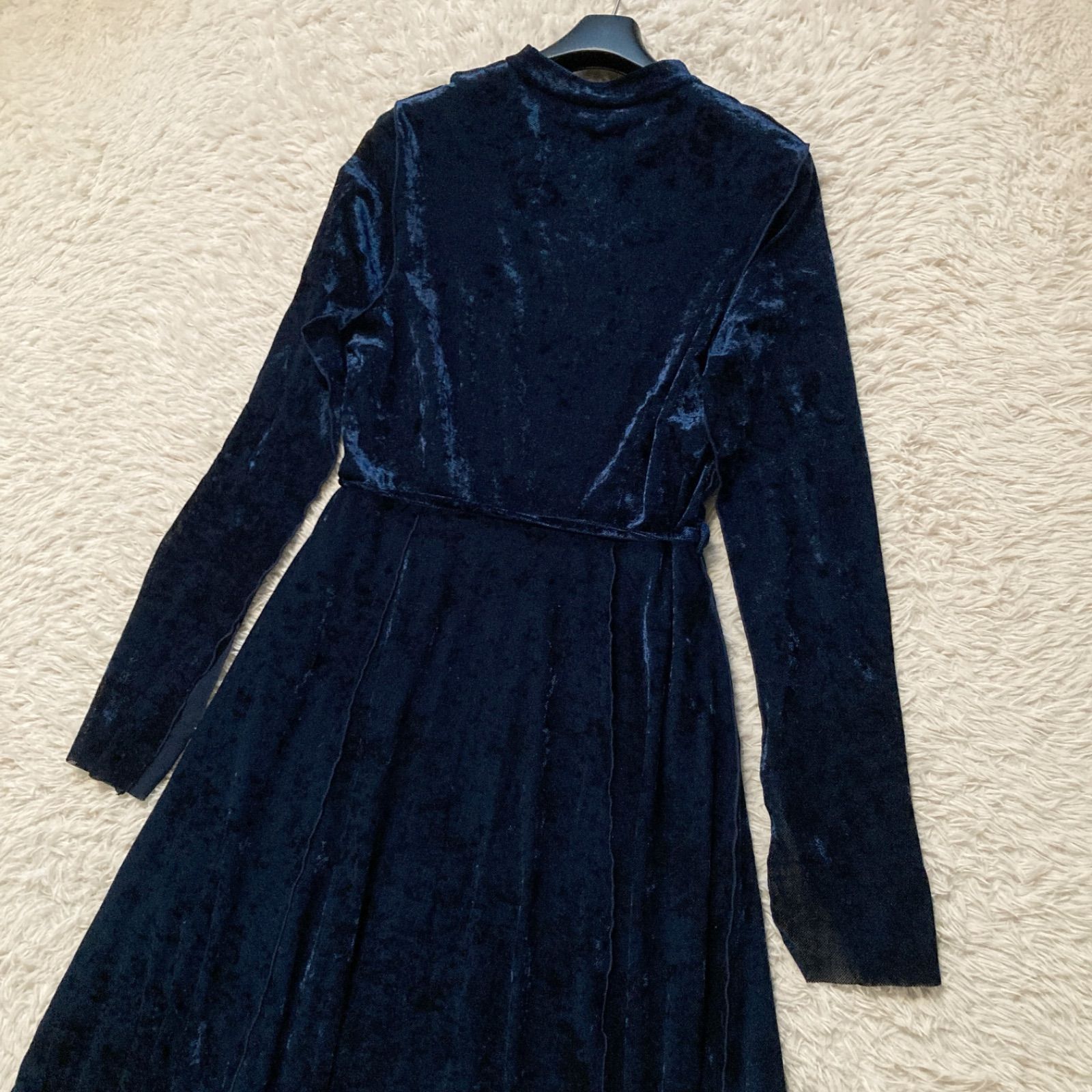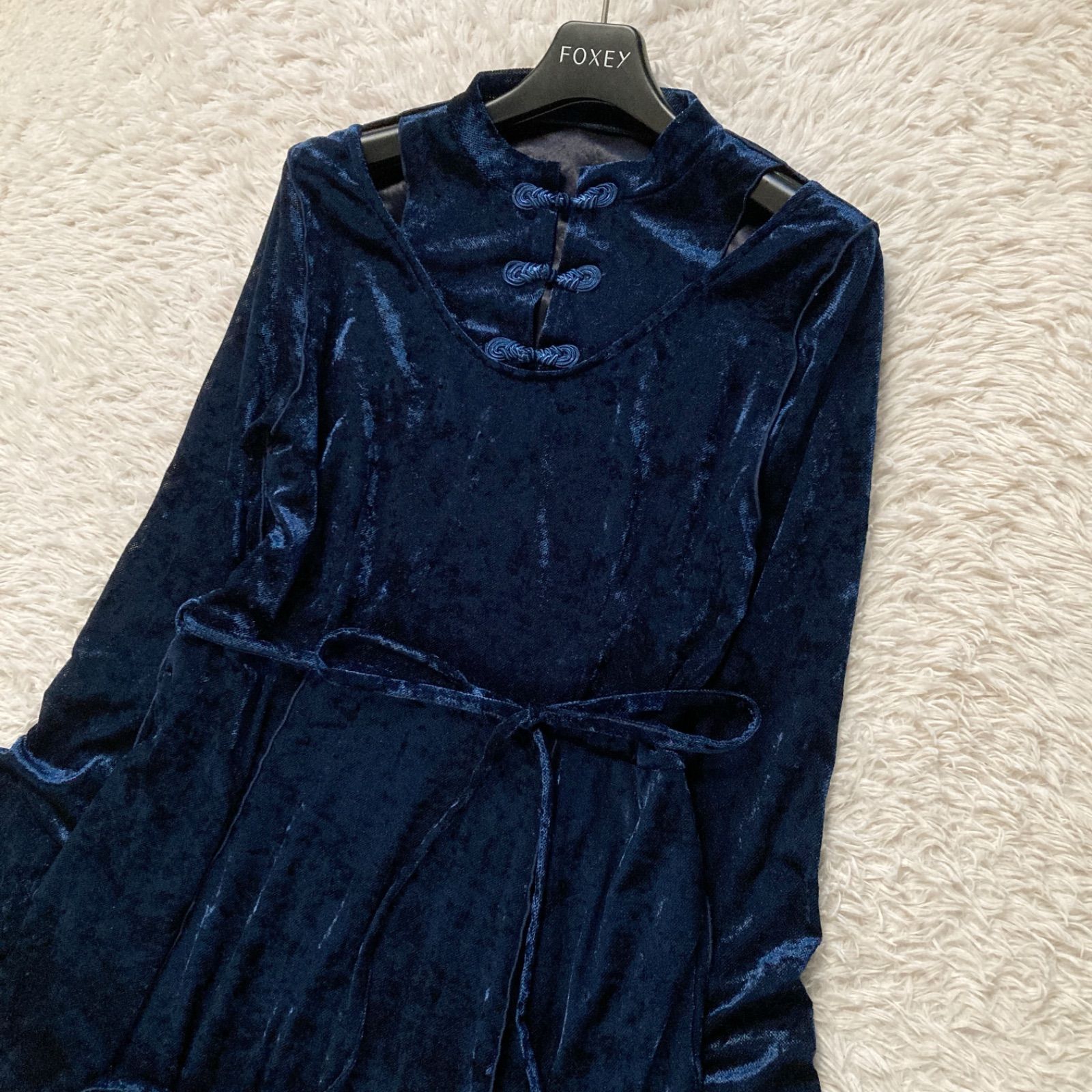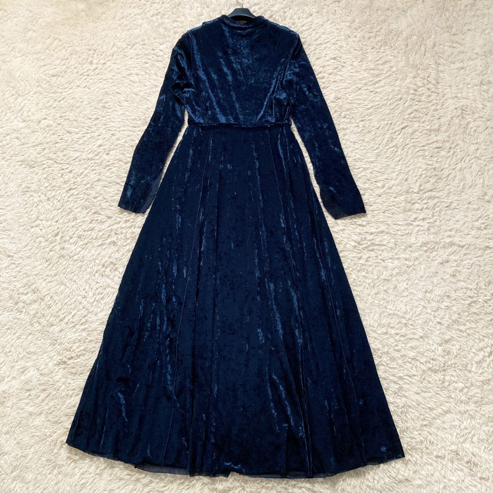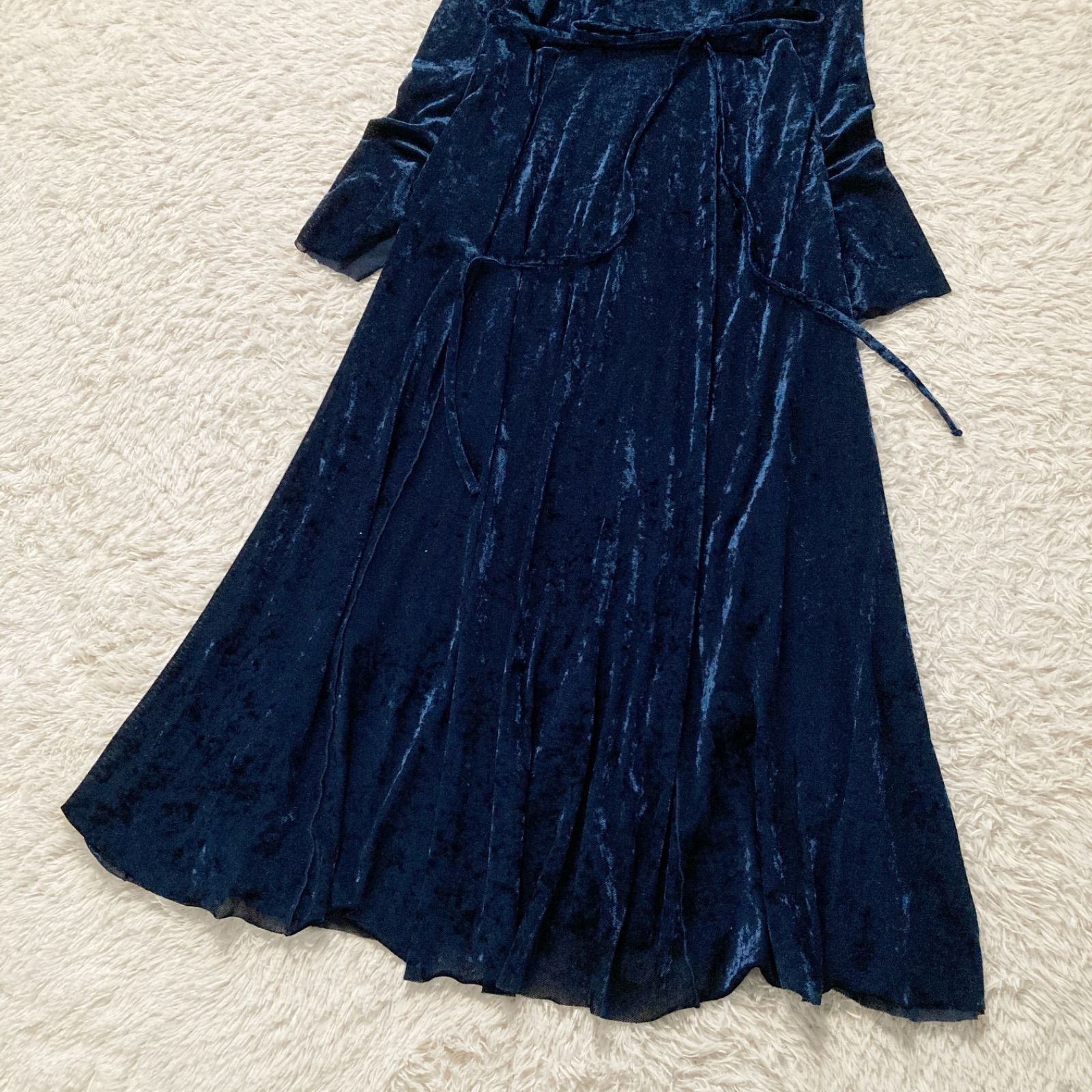 美品 ハレ HARE ベロアチャイナワンピース ロング ベルベット Aライン ネイビー 紺色 レディース フリーサイズ パーティー 結婚式 二次会 披露宴 お呼ばれ ドレス 華やか 高級感 上品 シアー 透け感 希少 レア 人気 完売品