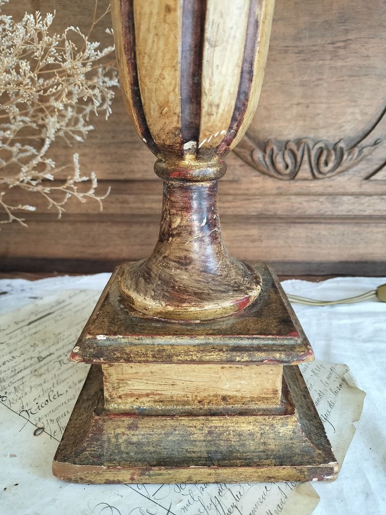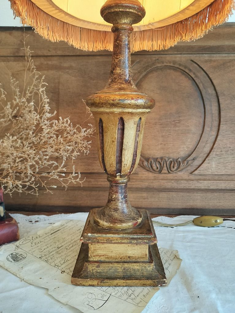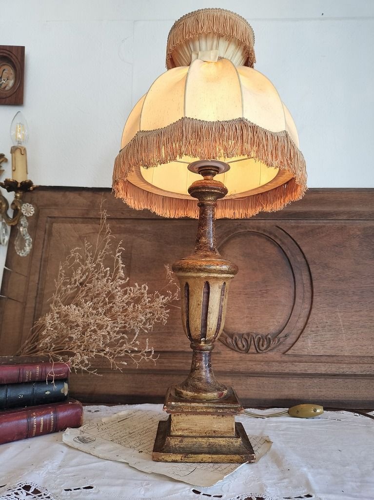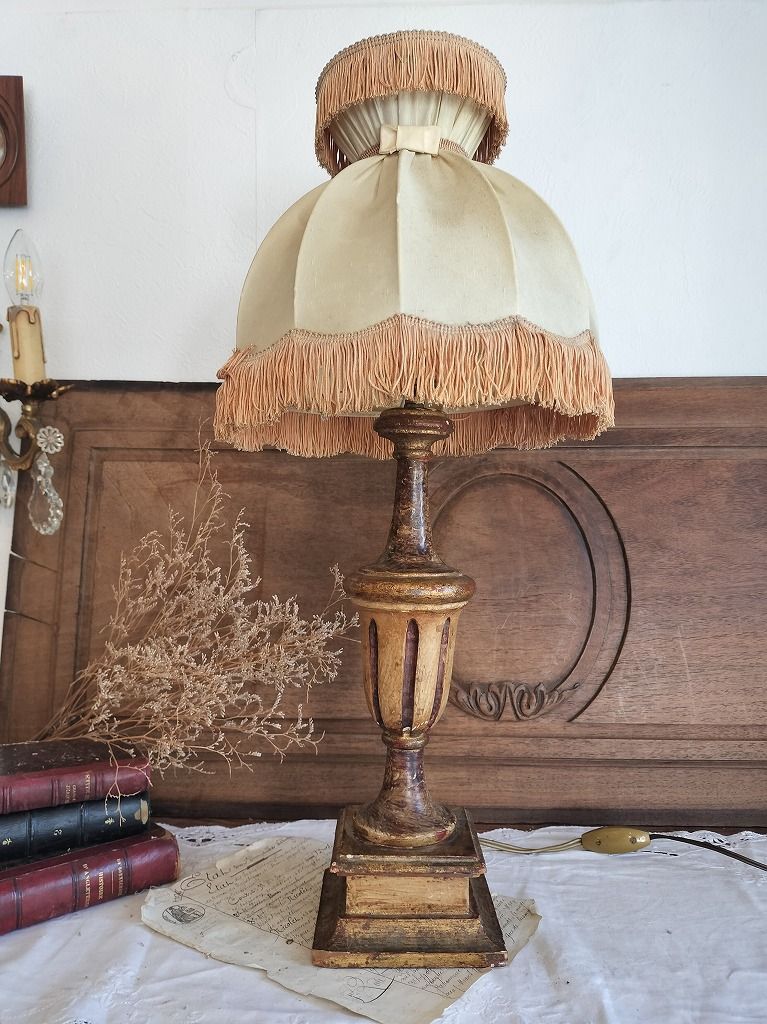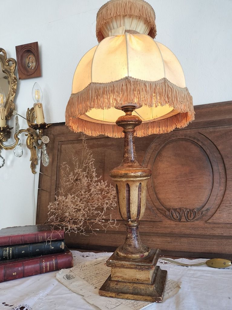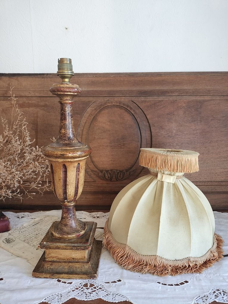 フランス アンティーク 卓上ランプ 木製 大きいい 布シェード つき 付き 照明 ライト です。