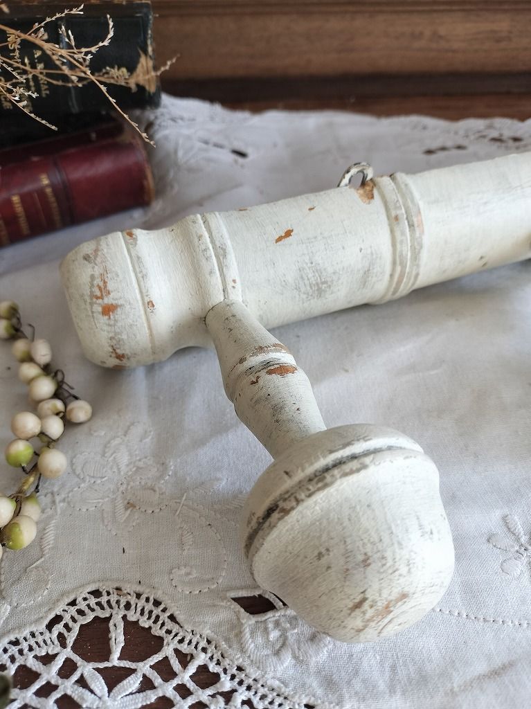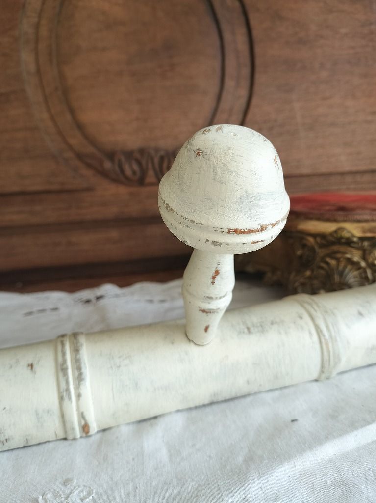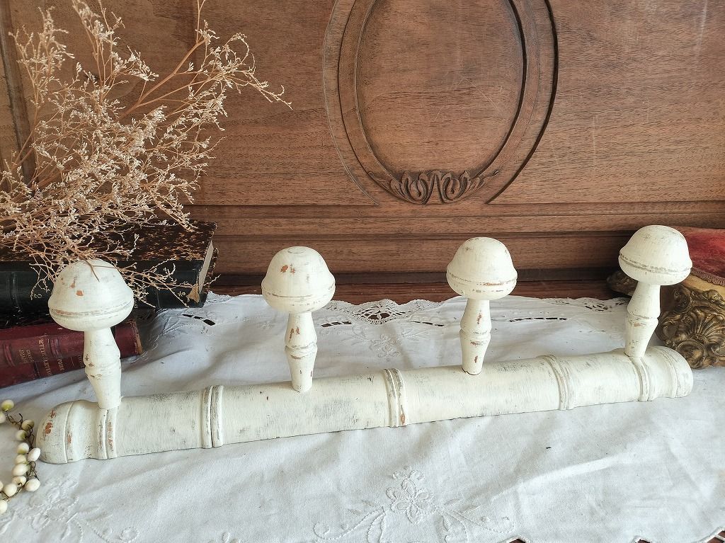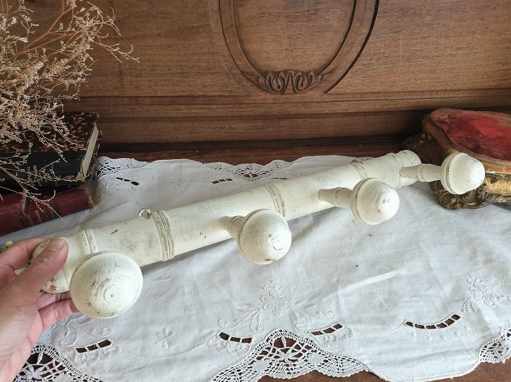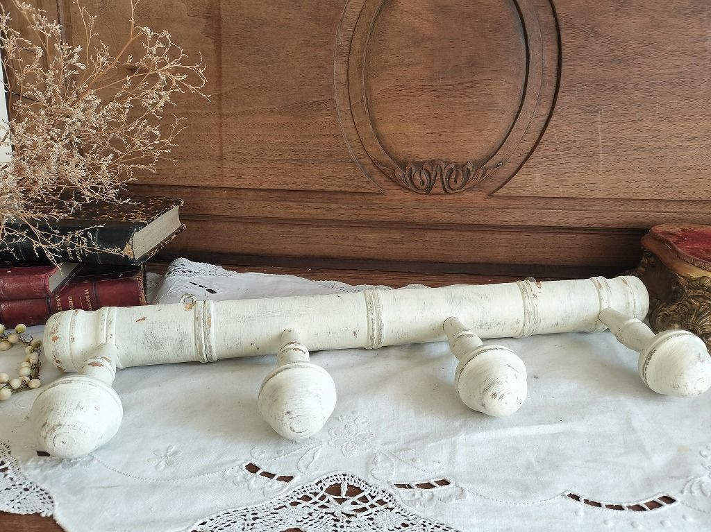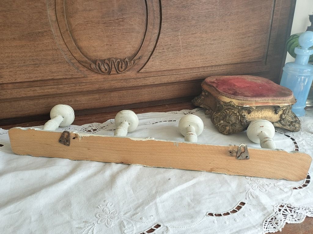 フランス アンティーク 壁掛け 白い 木製 4連 陶器 コート 帽子 掛け ラック です。