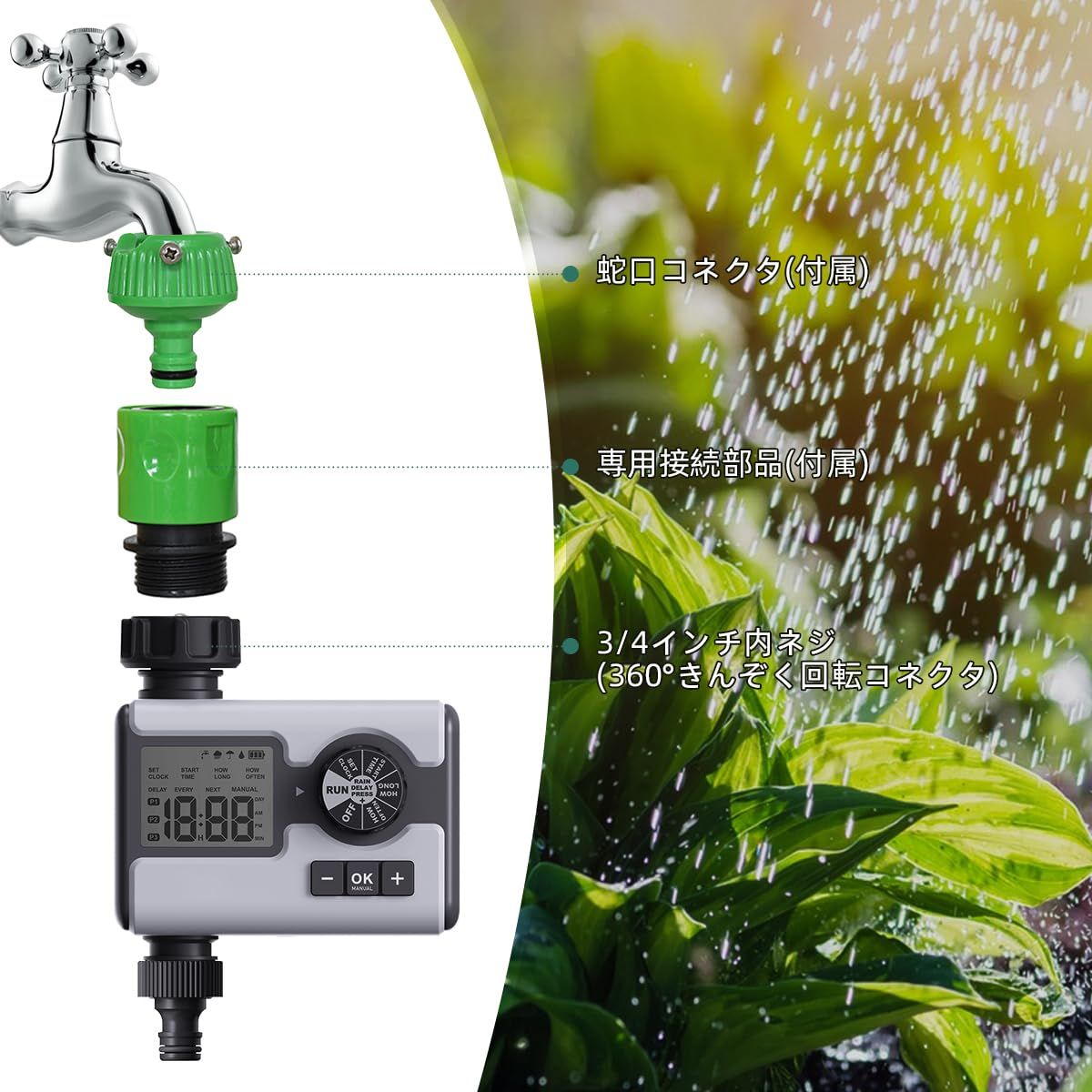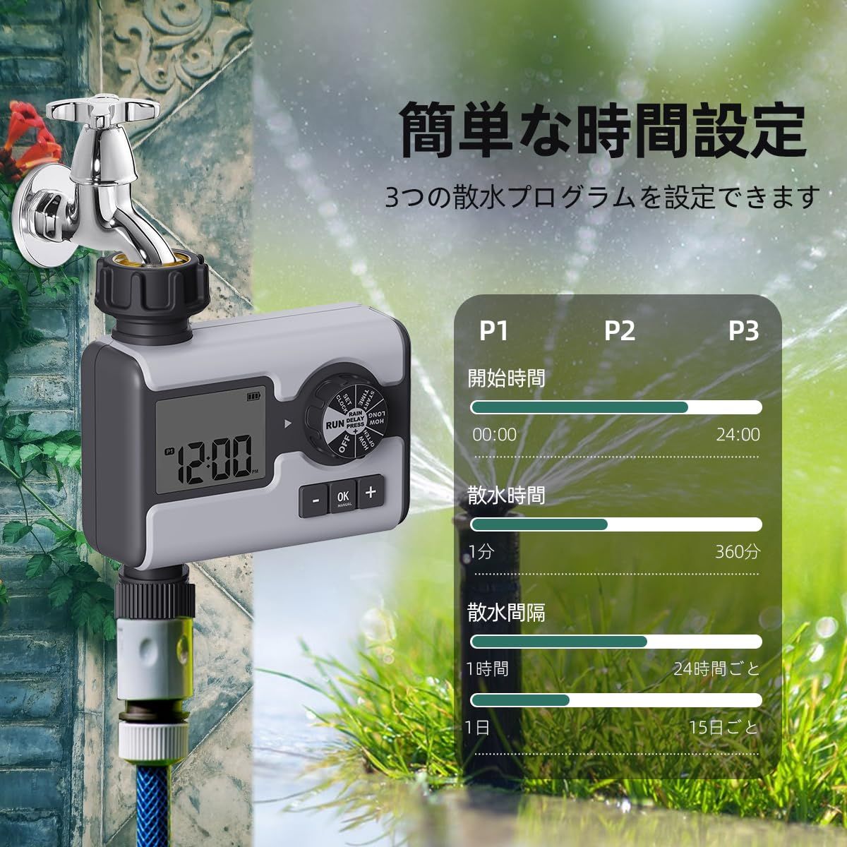 散水タイマー 自動散水ホース 植物灌水 自動水やり器 散水用具 灌漑システム 観葉植物 3つのプログラム可能な手順を備えたウォータータイマー雨遅延/手動/自動モード