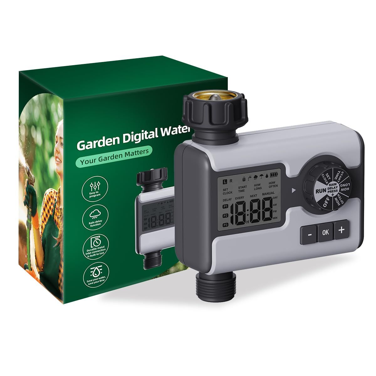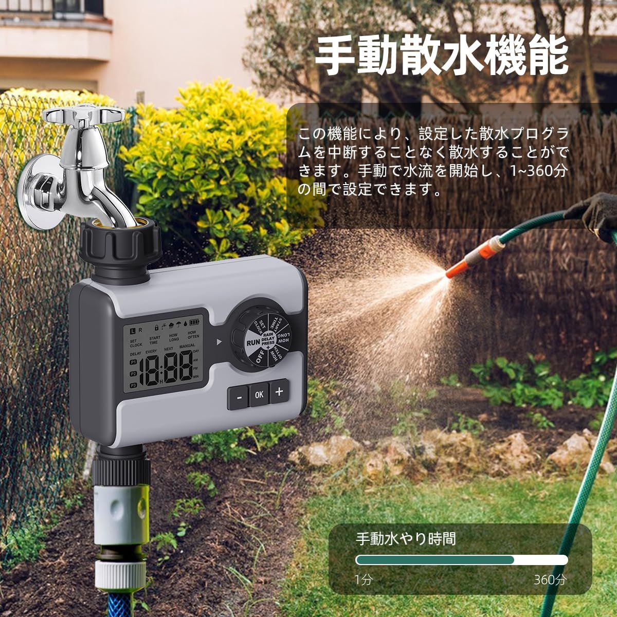 【散水時間をカスタマイズ】スプリンクラータイマーを使用すると、ニーズに合わせて正確な散水スケジュールを簡単に設定できます。ノブを回して散水時間、頻度、期間(1分から360分)を設定し、散水頻度(1時間から23時間または1日から15日)をカスタマイズして、庭を緑豊かに保ちながら時間と水を節約します。