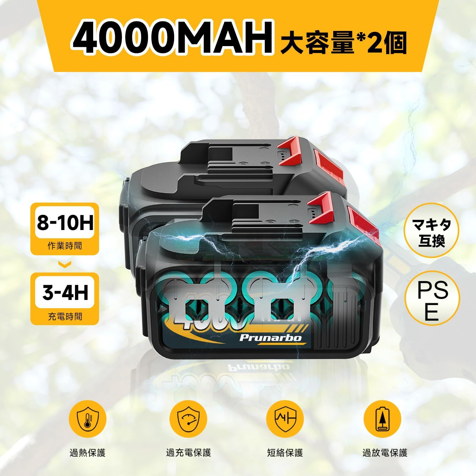 【18Vマキタ互換】電動剪定鋏は4000mAh大容量のバッテリーが2個付属してあり、付属の充電器は2個バッテリーを同時に充電可能です。2個合わせて8000mAhは10時間くらいの連続剪定作業ができます。バッテリーはすでにPSE認証取得済なのでごあんしんに使用いただけます。また、マキタの18Vバッテリーと互換可能なので、マキタバッテリーをお持ちの方にとって便利でコスパが高い逸品です。