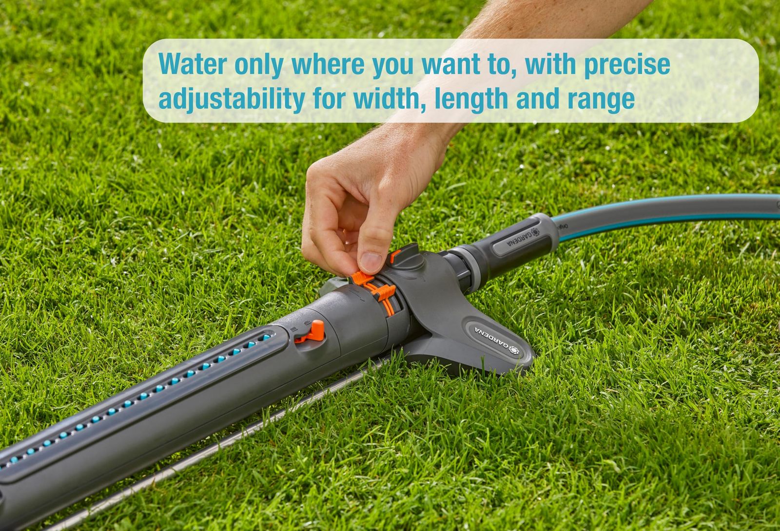 28㎡~350㎡の面積で散水し、乾燥した日でも芝生をやわらかな緑に保てる。7m~最大21mの散水距離は、無段階に簡単に調整可能。