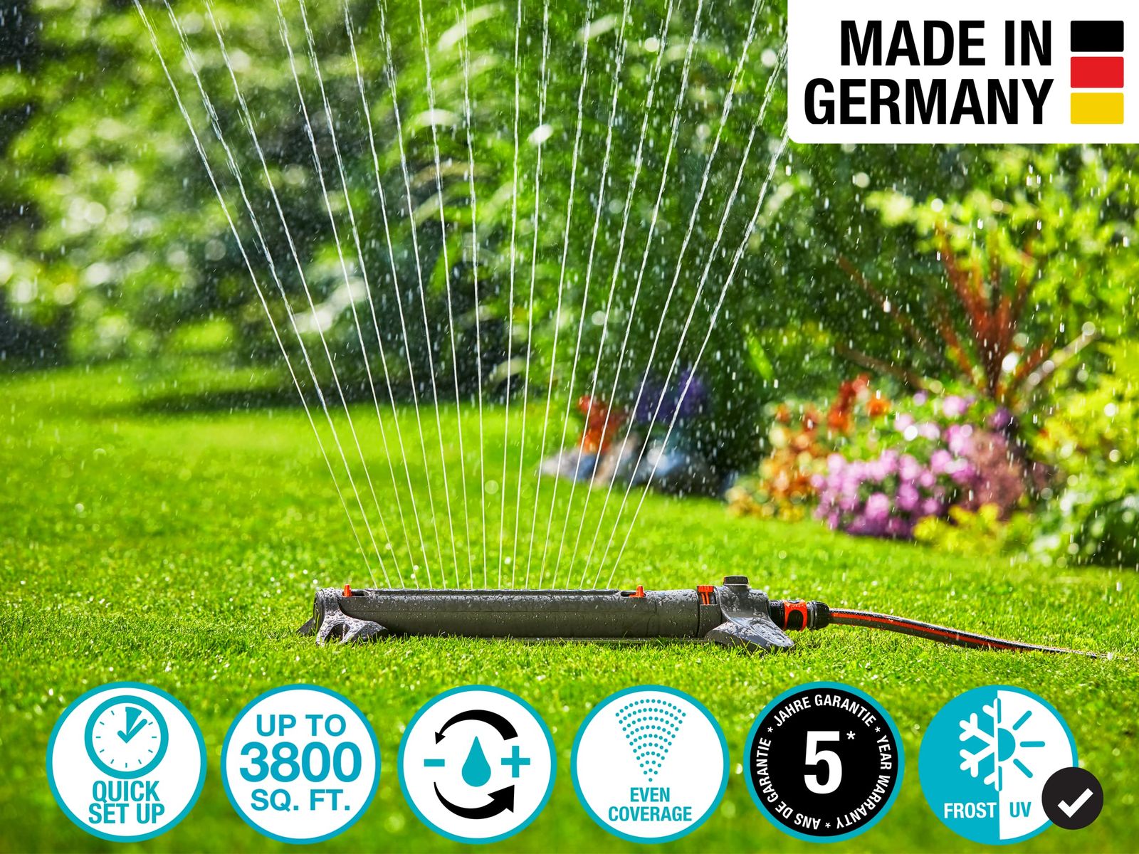 高品質なプラスチック素材とステンレスが採用されたスプリンクラーは、四季を通じて悪天候にも強い頑丈なつくり。ドイツ製 最大5年。