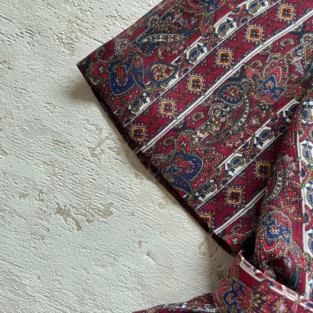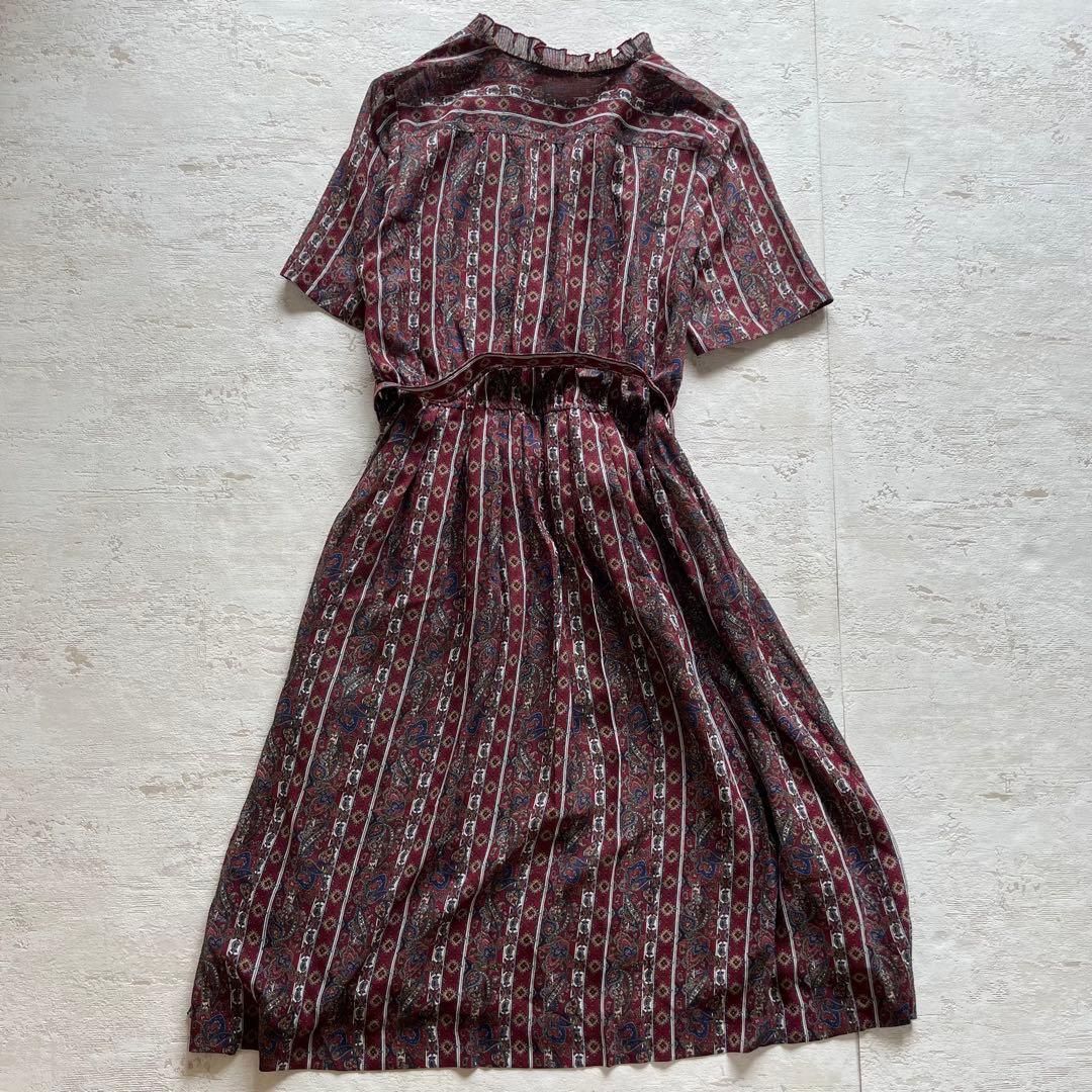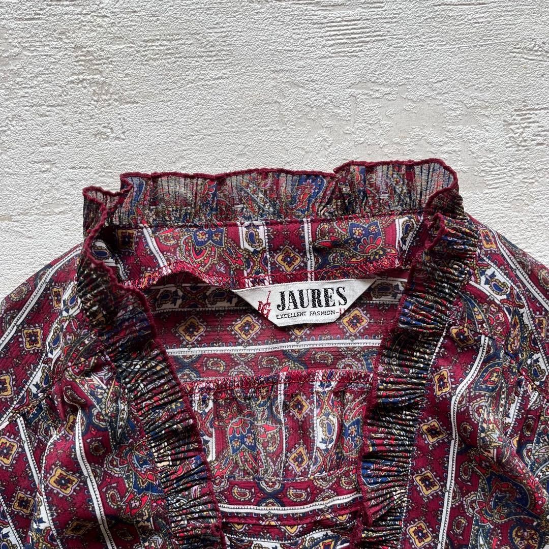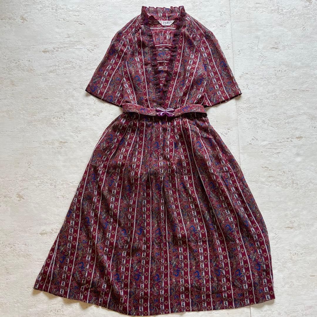 昭和レトロな雰囲気漂う「JAURES」のヴィンテージワンピースです。深みのあるボルドー系カラーにペイズリーや花柄の総柄が映え、華やかさと上品さを兼ね備えた一枚。フリルの効いた襟元や、共布ベルトに付いたリボンモチーフが女性らしさを引き立てます。マキシ丈で体型カバー力もあり、レトロコーデや新品ファッションが好きな方におすすめ。秋冬の羽織りやブーツと合わせても可愛く着こなせます。デイリー使いからお出かけまで幅広く活躍できるアイテムです。