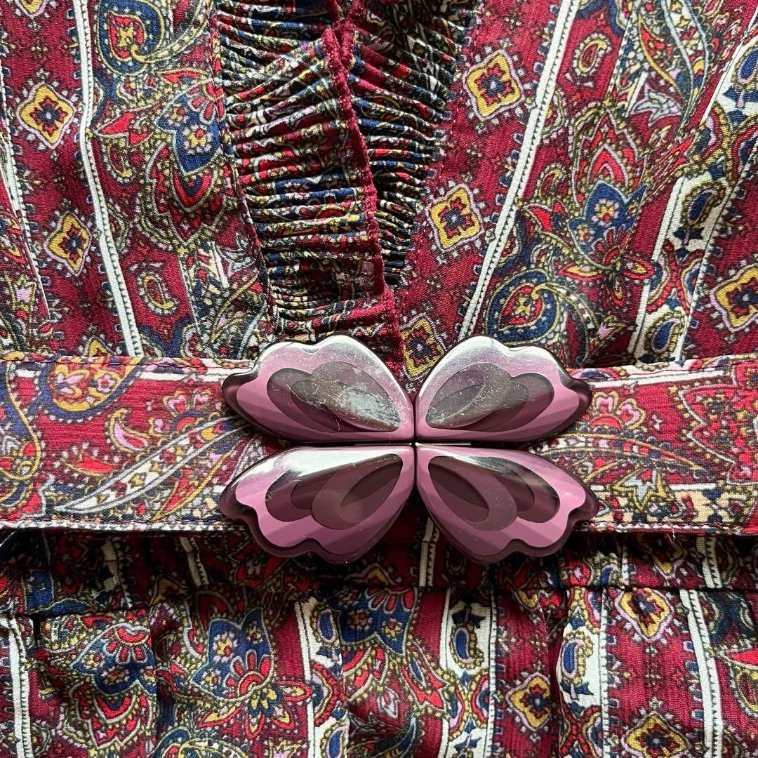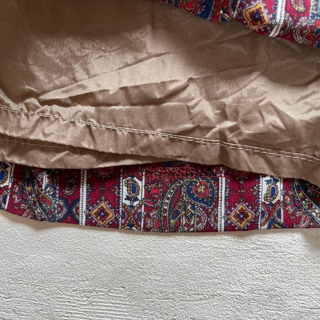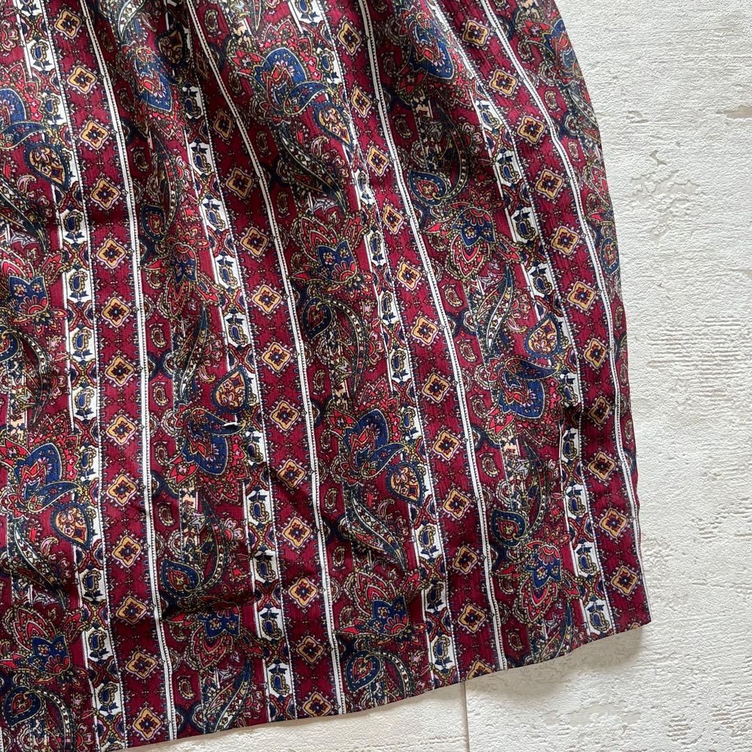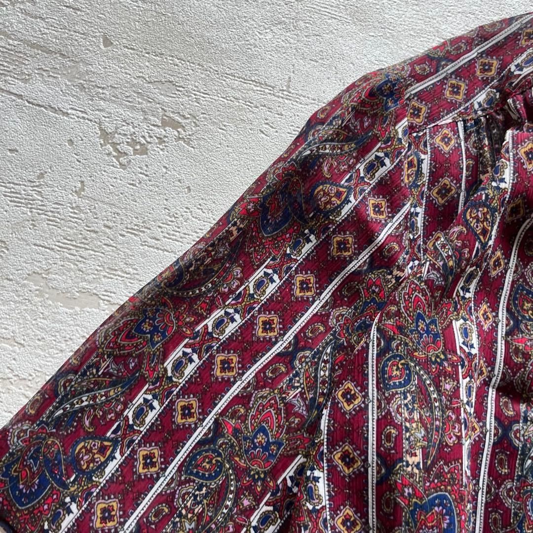 昭和レトロな雰囲気漂う「JAURES」のヴィンテージワンピースです。深みのあるボルドー系カラーにペイズリーや花柄の総柄が映え、華やかさと上品さを兼ね備えた一枚。フリルの効いた襟元や、共布ベルトに付いたリボンモチーフが女性らしさを引き立てます。マキシ丈で体型カバー力もあり、レトロコーデや新品ファッションが好きな方におすすめ。秋冬の羽織りやブーツと合わせても可愛く着こなせます。デイリー使いからお出かけまで幅広く活躍できるアイテムです。