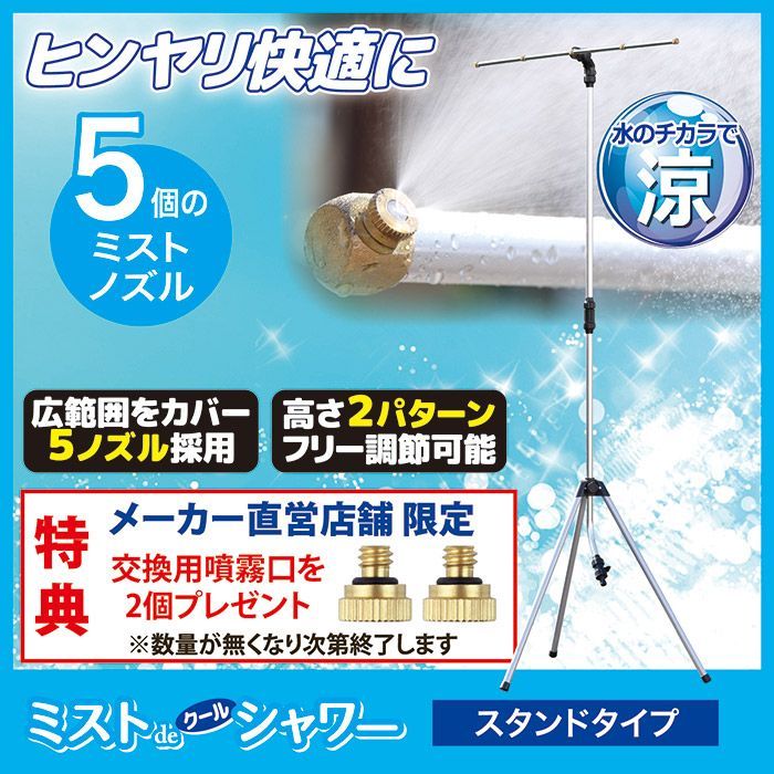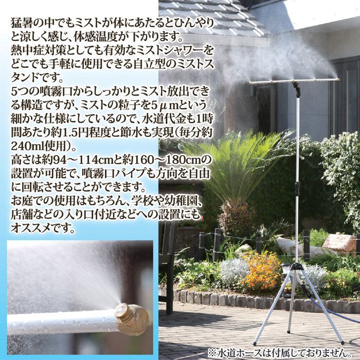 猛暑の中でもミストが体にあたるとひんやりと涼しく感じ、体感温度が下がります。熱中症対策としても有効なミストシャワーをどこでも手軽に使用できる自立型のミストスタンドです。5つの噴霧口からしっかりとミスト放出できる構造ですが、ミストの粒子を5μmという細かな仕様にしているので、水道代金も1時間あたり約1.5円程度と節水も実現(毎分約240ml使用)。高さは約94〜114cmと約160〜180cmの設置が可能で、噴霧口パイプも方向を自由に回転させることができます。お庭での使用はもちろん、学校や幼稚園、店舗などの入り口付近などへの設置にもオススメです。