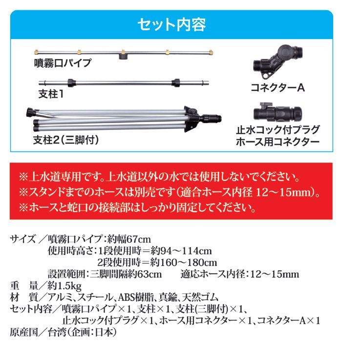 噴霧口パイプ:約幅67cm/使用時高さ:1段使用時=約94〜114cm 2段使用時=約160〜180cm/設置範囲:三脚間隔約63cm/適応ホース内径:12〜15mm