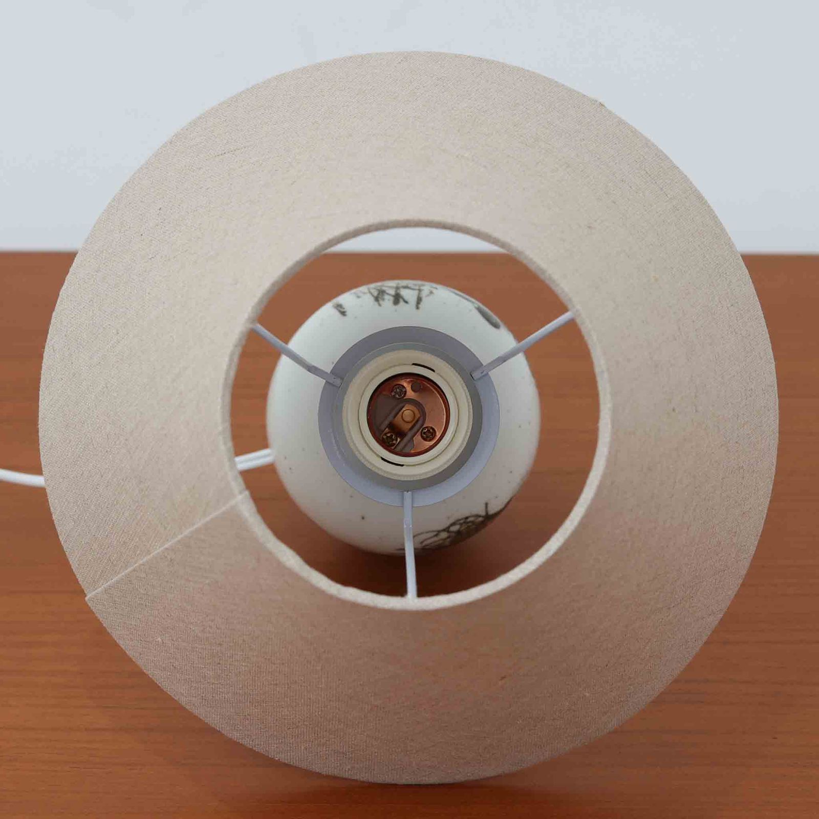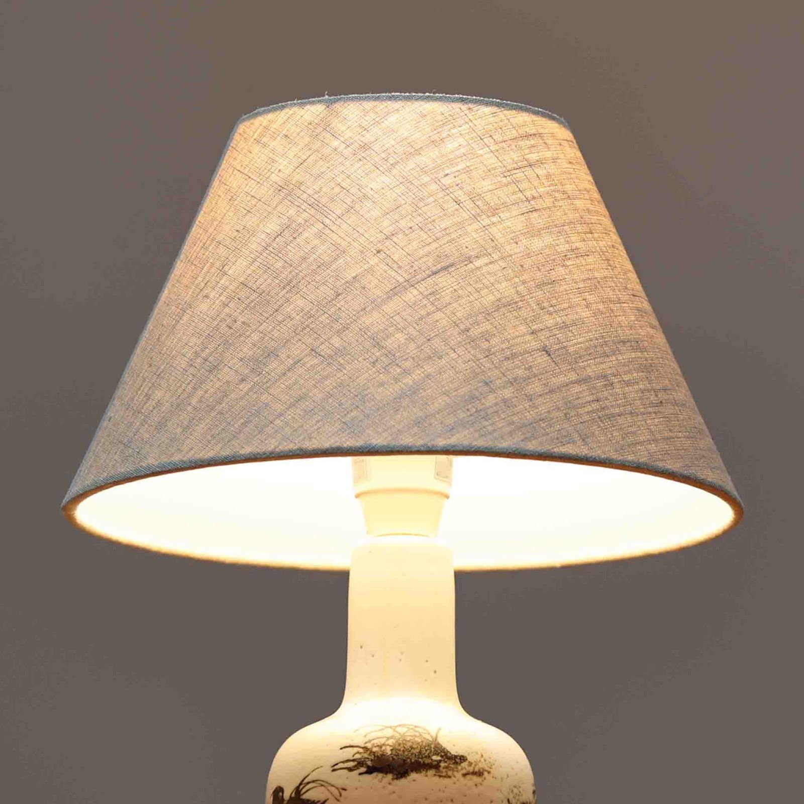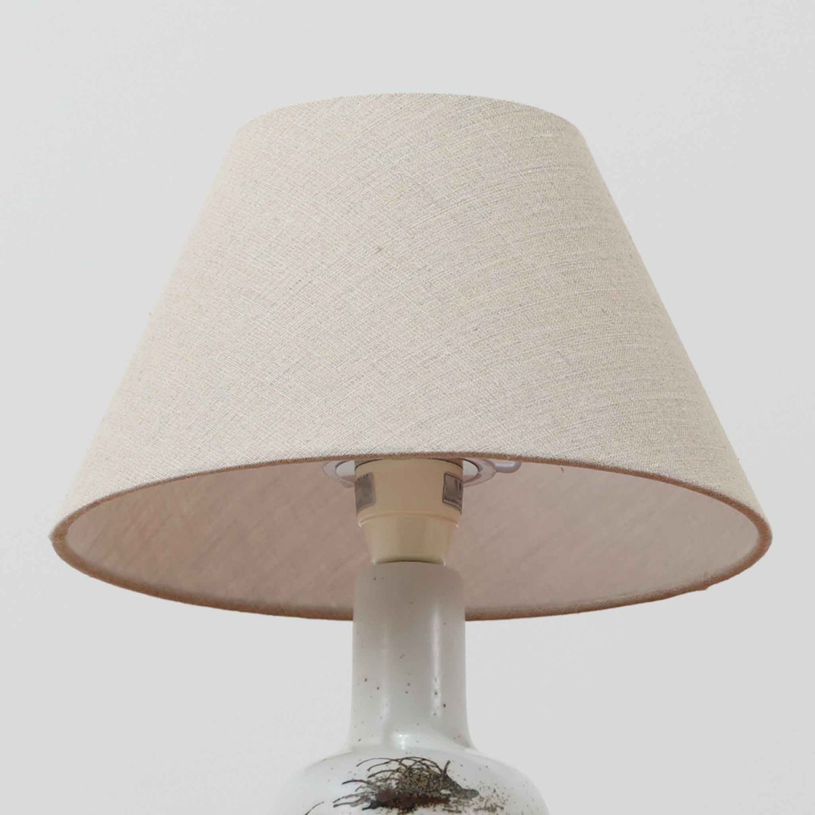 製造過程によるものかは不明ですが、ベースにほんのりと黄ばみが見られます。また、細かな擦り傷など軽微なダメージがあります。ビンテージ品としては良好な状態です。シェードはスウェーデンのブランドで未使用品です。リネンシェードは天然素材ならではの風合いや質感が魅力ですが、その特性上、製造過程において細かなほつれや色糸の混入、ネップ(糸の節)などが見られることがございます。これらは素材の特性によるものであり、あらかじめご了承ください。