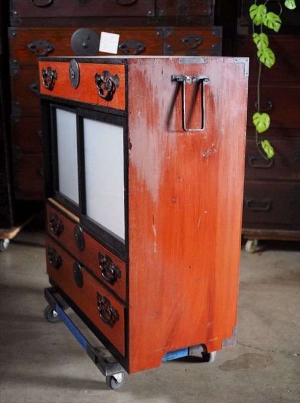 This Shinshu-style modern Japanese cabinet dates back to the Meiji period. It's in good condition for a 100-year-old item, but the paint has deteriorated. The glass was replaced later. It would look great in a room with wooden floors. As this is an older piece, there is some deterioration, so please check the images and videos. (◎ [Note] ① Items over K size cannot be delivered via "household goods delivery" on Tuesdays. ② Items over 220 and H size cannot be delivered to some remote islands.) If you have any questions, please contact us by phone, LINE, email, or Instagram message. We will answer honestly.(幅)860mm×(奥)420mm×(高)950mm