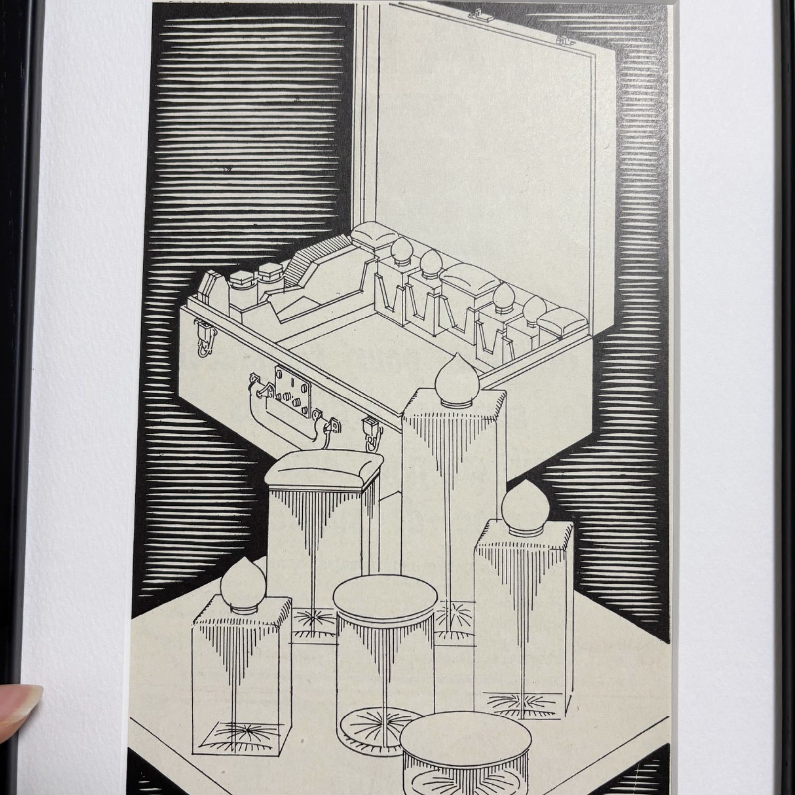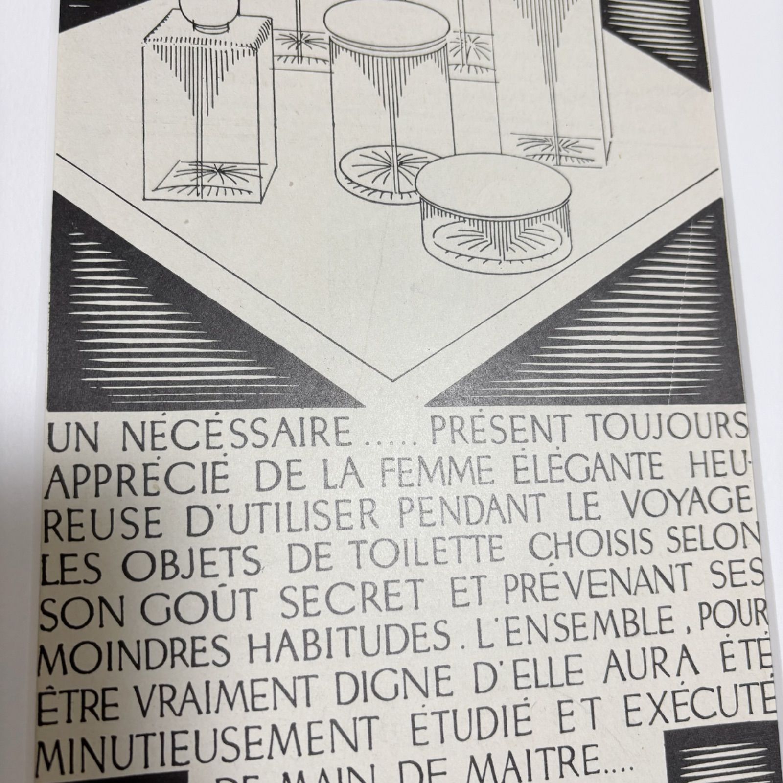 香水瓶とトランクを繊細なペン画で描いたモノトーンのデザインは、アール・デコの優雅さと旅する女性のエレガンスを表現しています。