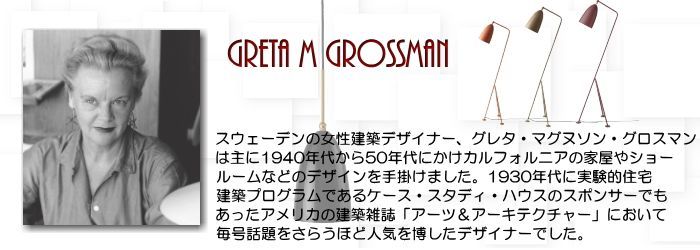 スウェーデンの女性建築デザイナー、グレタ・マグヌソン・グロスマンは主に1940年代から50年代にかけカルフォルニアの家屋やショールームなどのデザインを手掛けました。1930年代に実験的住宅建築プログラムであるケース・スタディ・ハウスのスポンサーでもあったアメリカの建築雑誌「アーツ&アーキテクチャー」において毎号話題をさらうほど人気を博したデザイナーでした。