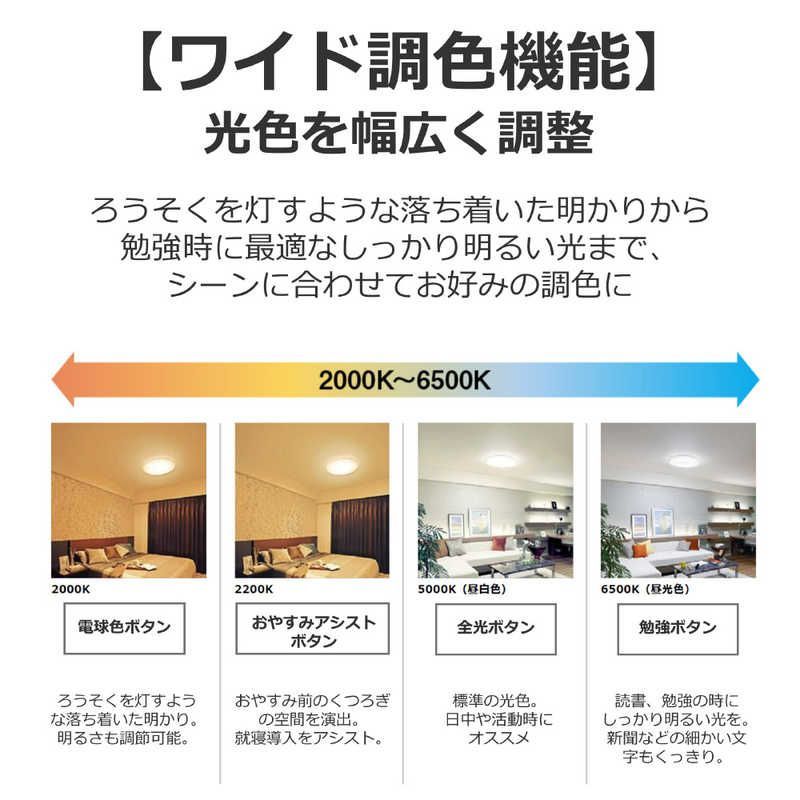 調光/調色:連続調光(約5%~100%)LED常夜灯6段階調光 色温度 6500~2000K