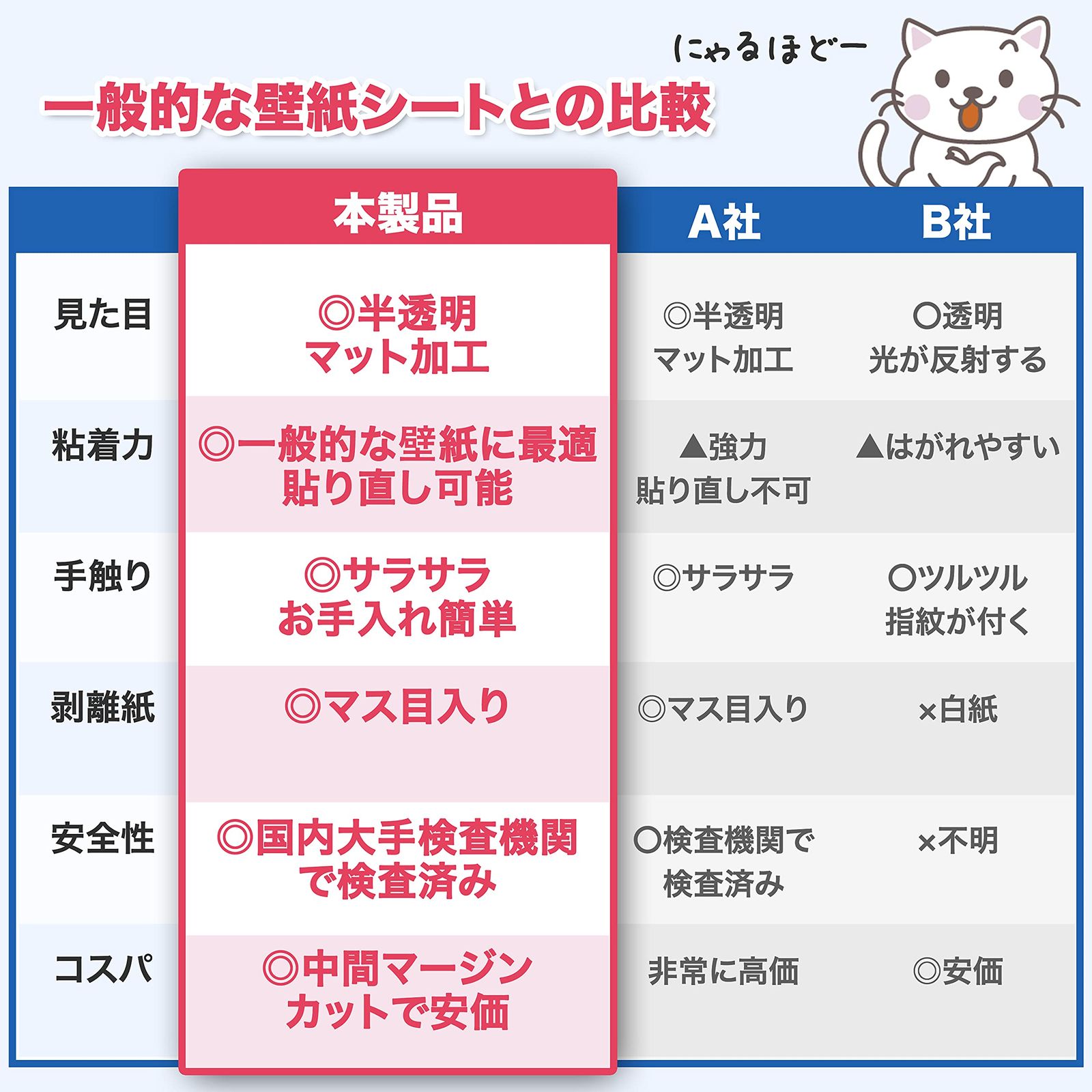 【お客様のご意見から粘着力をアップしました】現在の日本で多く使用されている壁紙に最適な粘着力を研究しました。 従来の他社製品よりやや強めに仕上げています。すでに傷がついていたり、古くなった壁紙ですと剥がれやすくなりますのでご了承下さい。剥がせるので賃貸でも安心です。 材質によっては時間経過により若干ノリでべたつく場合が有りますが消しゴムで軽くこすると簡単にとることが出来ます。
