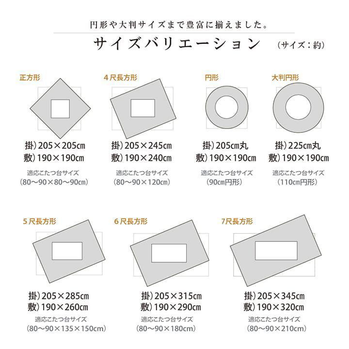 ■サイズ展開も7サイズととても豊富。スタンダートな四角のこたつ台5サイズから円形のこたつ台2サイズまで揃えています。