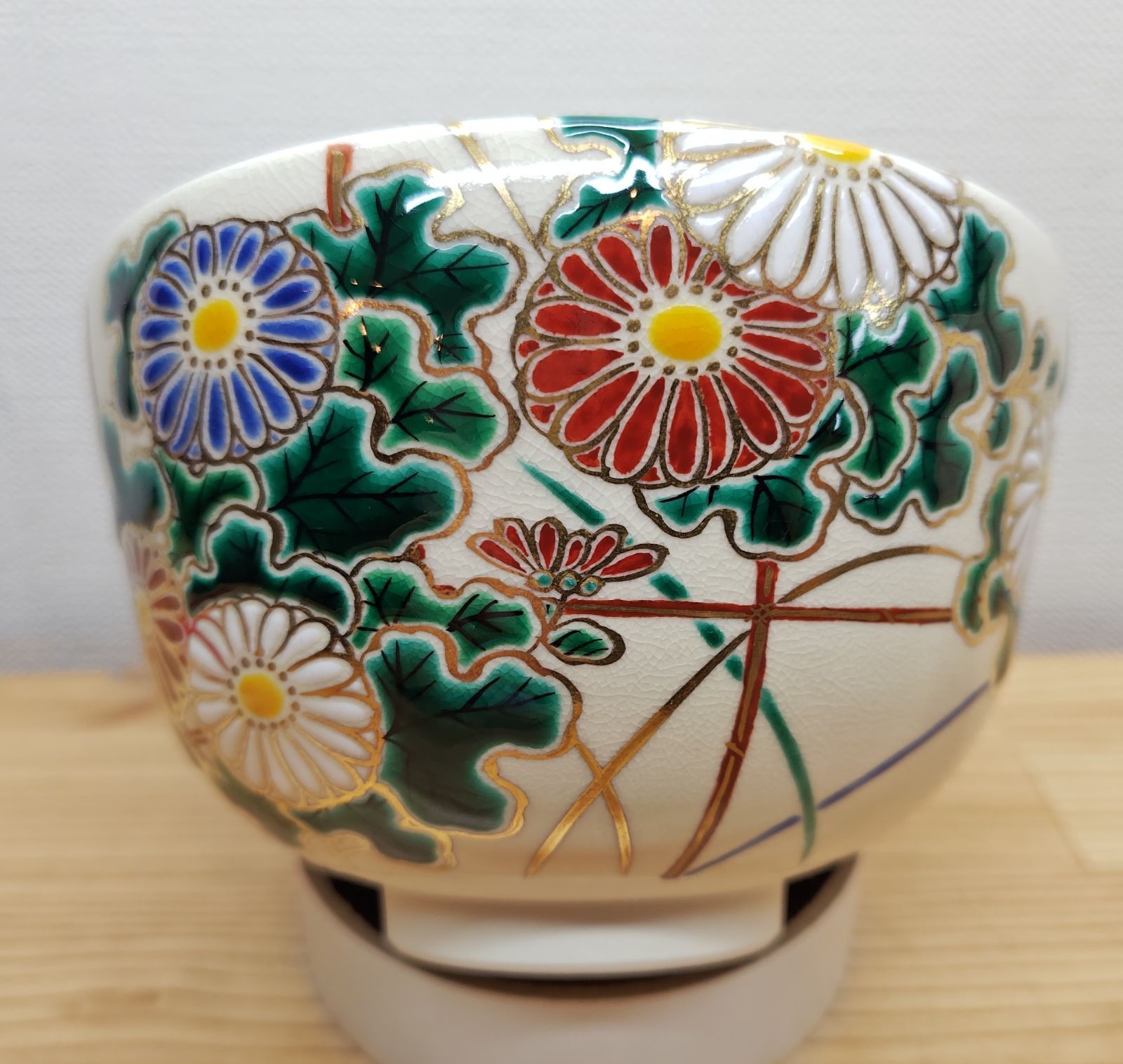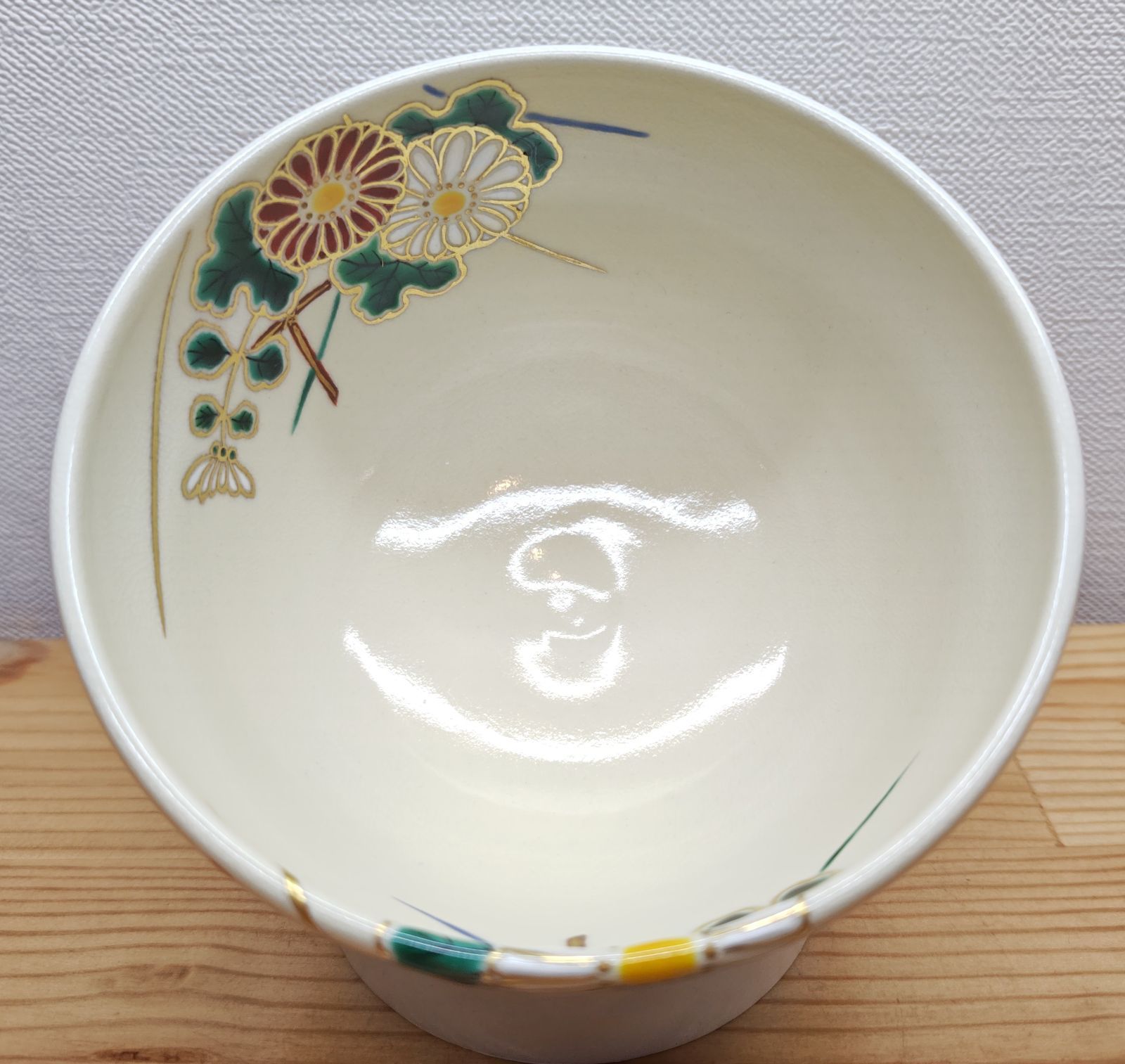 色鮮やかな菊の絵と葉っぱの緑色が綺麗なお茶碗です。