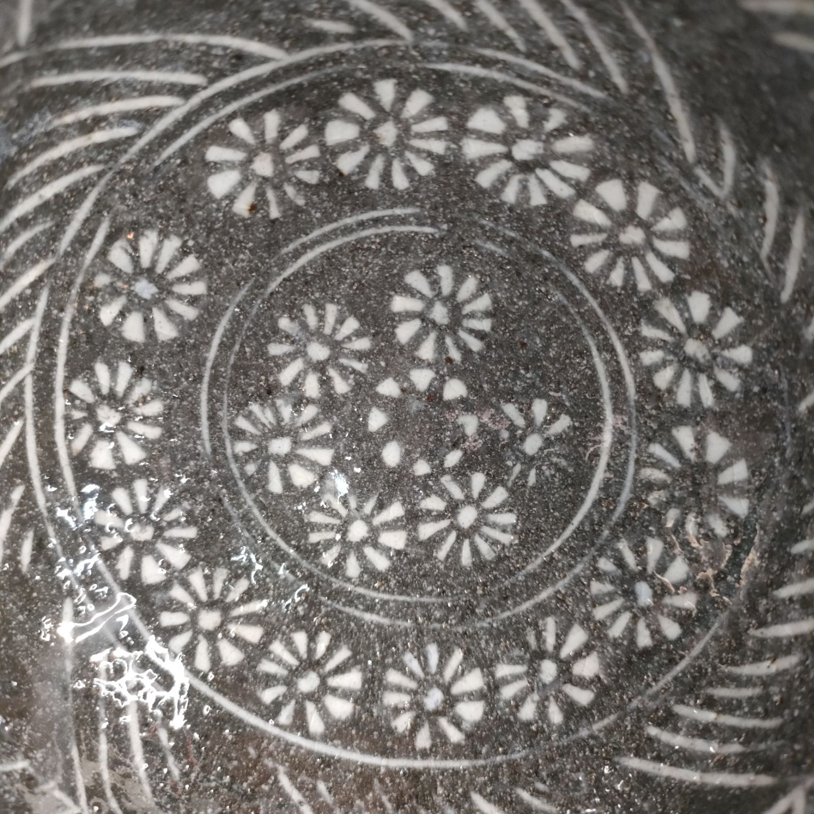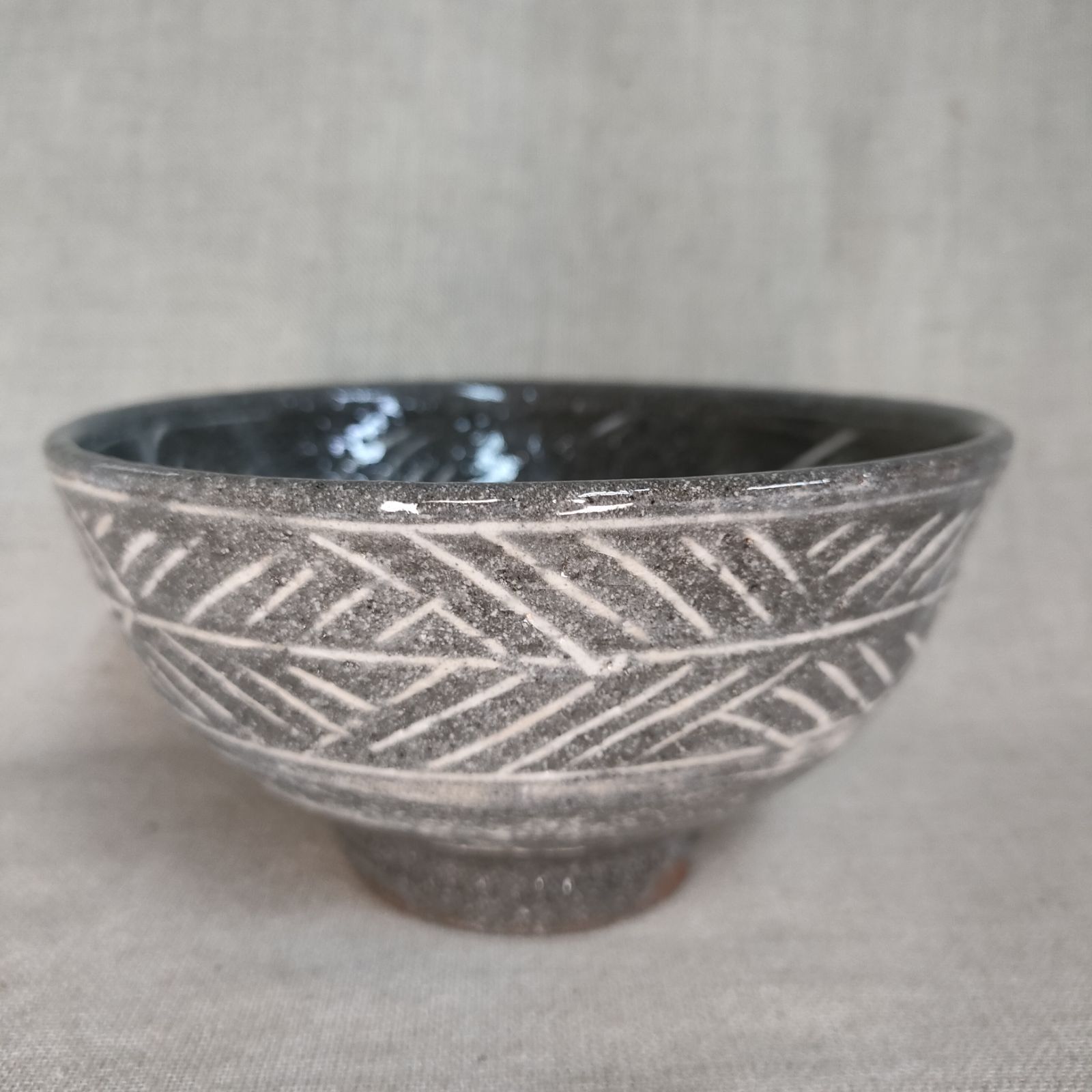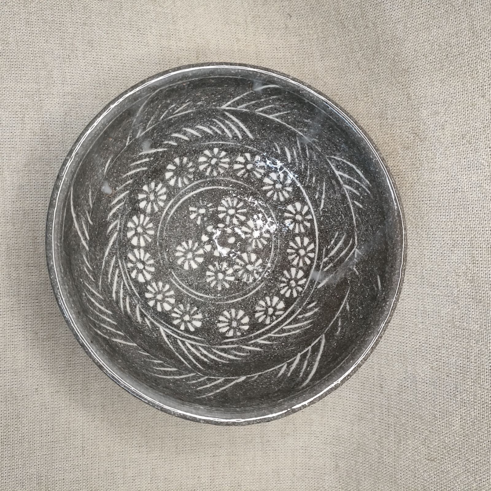 唐津赤土ロクロ成形後線刻紋様印花文施し、白土化粧掛けて素焼きのあと本焼きしました。