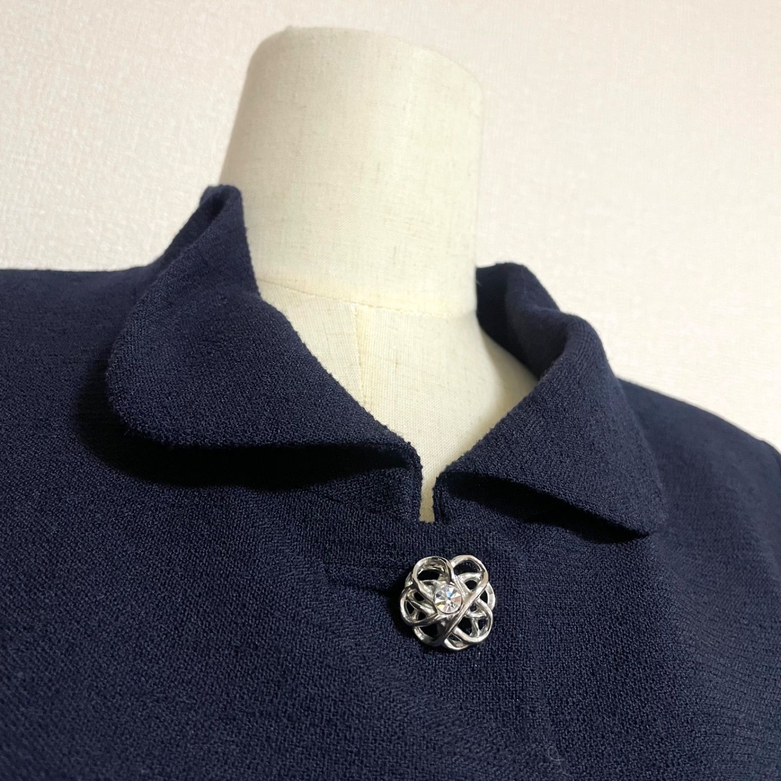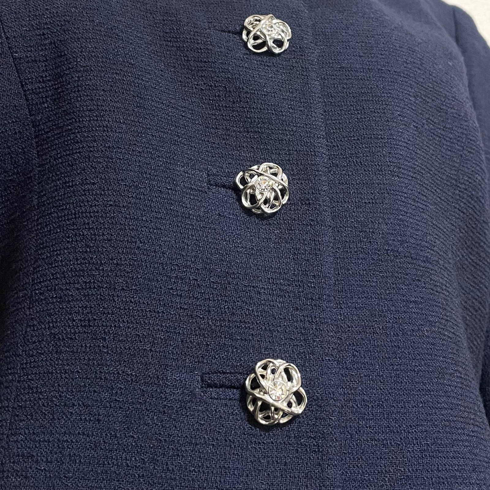 美しいシルエットのスカートスーツセットアップです。高級感のあるウールツイード生地。ジャケットについたボタンについたラインストーンがダイヤのように煌めきます。
