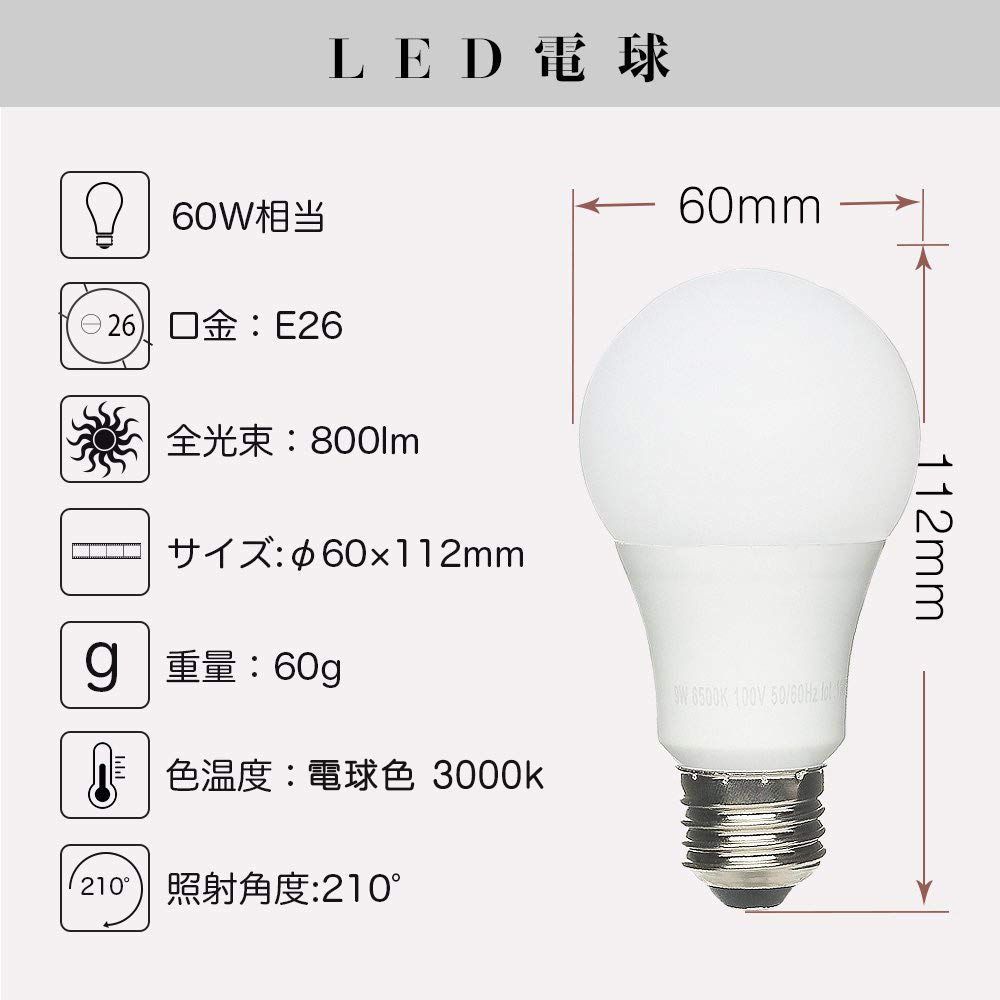 【長寿命・省エネ】このLED電球は白熱電球60W形相当で、また従来の電球より消費電力を85%カットし、節電になります。設計寿命は約25000時間で、1日10時間以上のご利用でも約7年を持ちできます。