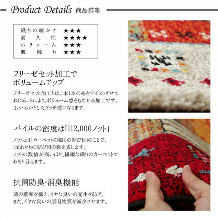 本商品のパイル部分にはポリプロピレン素材を使用しております。ポリプロピレンはヘタリにくく、耐久性に優れ、繊維の中でも軽い素材です。また、汚れが付着しにくく、遊び毛や毛玉が非常に出にくいという特徴もあります。ホットカーペットカバーや床暖房にも対応しております。抗菌・防臭、消臭機能がついていますので、一年を通して快適にお使いいただけます。