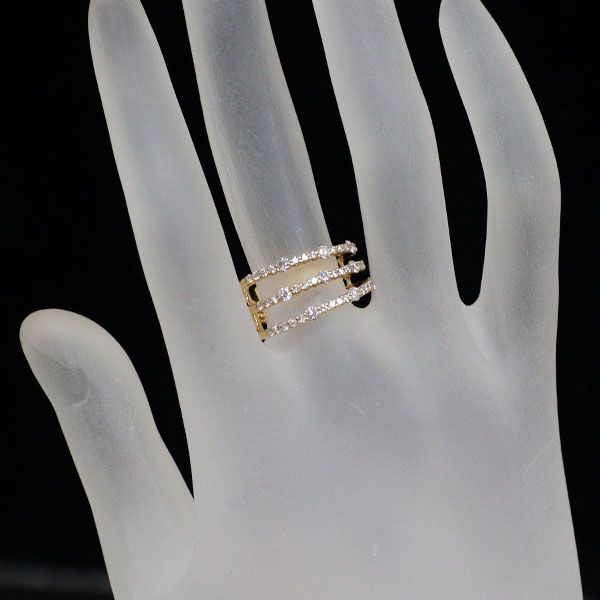 トータル0.80ctのダイヤモンドを贅沢にセットした、存在感のあるイエローゴールドリングです。長さの異なる三本のラインがユニークなデザイン。横から見ると斜めに見えるラインが印象的です。躍動感あるフォルムがお手元を魅力的に飾る、個性的なダイヤモンドジュエリーをお楽しみください。