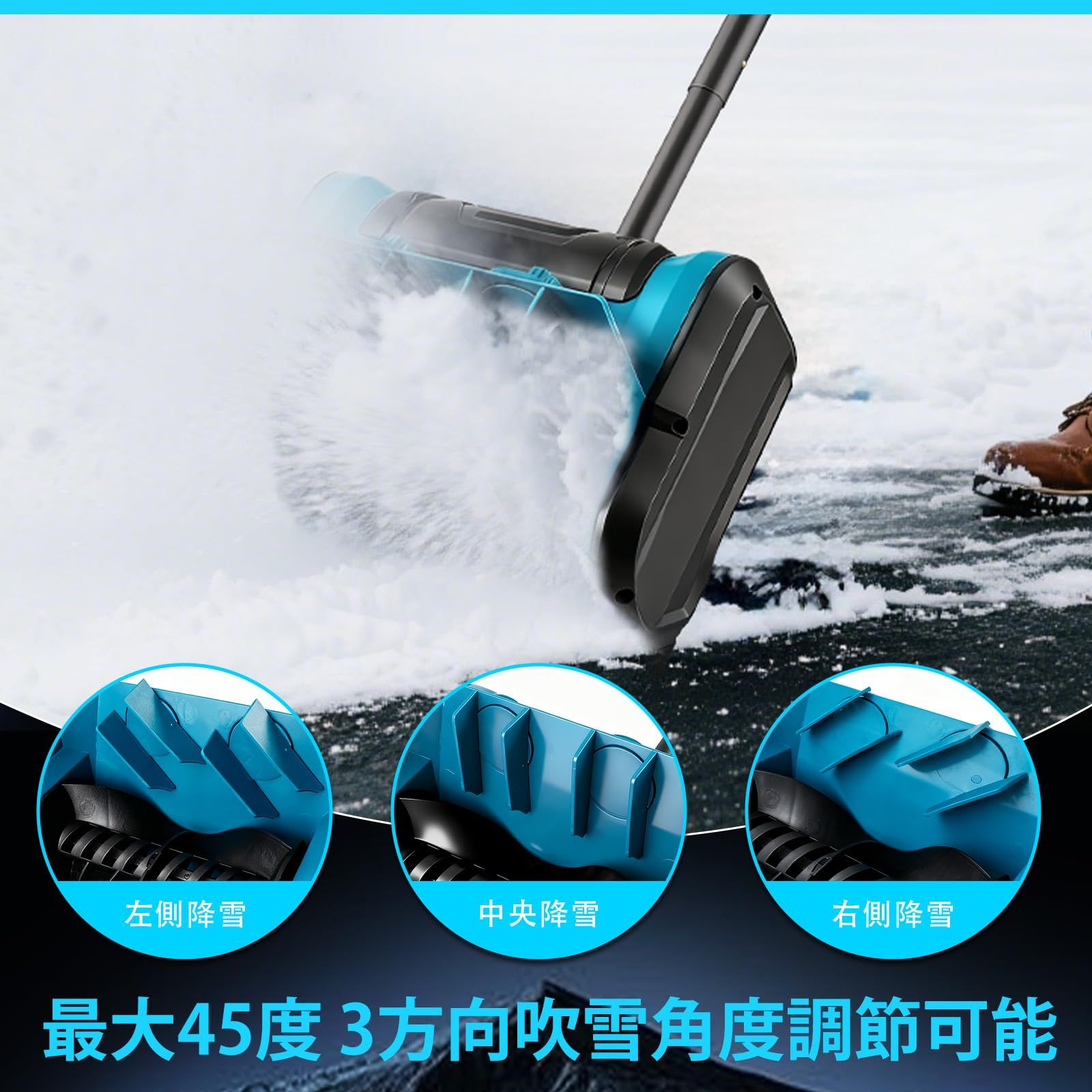 最大投射距離8M & 除雪高さ30CM & 除雪幅30CM & 最大45度3方向吹雪角度調節この除雪機は、最大8メートルの投射距離を実現し、積雪を遠くまで飛ばすことができます。これにより、雪がその場に積もって不便を生じるのを防ぎます。同時に、除雪高さは30CM、除雪幅は30CMであり、厚さ30センチ以下の積雪を効果的に除去できます。中型の積雪層の除去に適しています。この電動除雪機は投射角度の調節をサポートしており、左、右、前へ最大45°まで調整可能です。実際のニーズに応じて雪の投射方向を柔軟にコントロールでき、雪が望まない場所に積もるのを防ぎます。