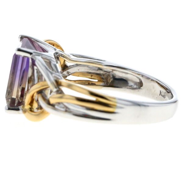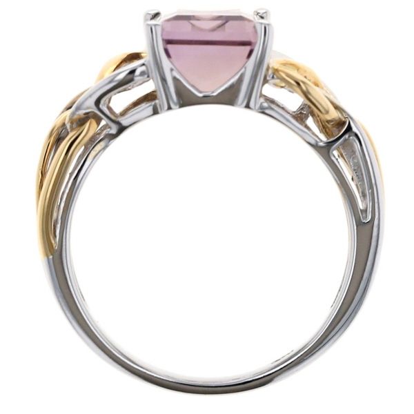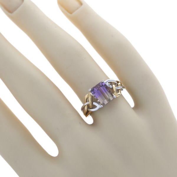 【商品紹介】イエローゴールドとホワイトゴールドを組み合わせた、ユニークでデザイン性の高いコンビネーションリングです。リングの中央には、二色の色を持つ神秘的な宝石アメトリンが、堂々としたレクタングルカットの一粒石としてセッティングされています。このアメトリンは、パープルとイエローの美しいバイカラーのグラデーションが特徴で、光を取り込むたびに繊細にきらめきます。石を支えるアーム部分は、イエローゴールドとホワイトゴールドの地金を緻密に編み込んだようなデザインが採用されています。アームの内側には透かし模様が施されており、軽やかな印象と立体感を両立させています。個性的なカラーストーンと、洗練されたコンビの色合いが融合した、手元をスタイリッシュに飾るアーティスティックなジュエリーです。