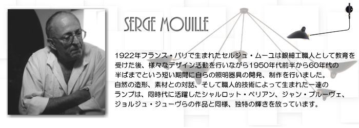1922年フランス・パリで生まれたセルジュ・ムーユは銀細工職人として教育を受けた後、様々なデザイン活動を行いながら1950年代前半から60年代の半ばまでという短い期間に自らの照明器具の開発、制作を行いました。自然の造形、素材との対話、そして職人的技術によって生まれた一連のランプは、同時代に活躍したシャルロット・ペリアン、ジャン・プルーヴェ、ジョルジュ・ジューヴらの作品と同様、独特の輝きを放っています。