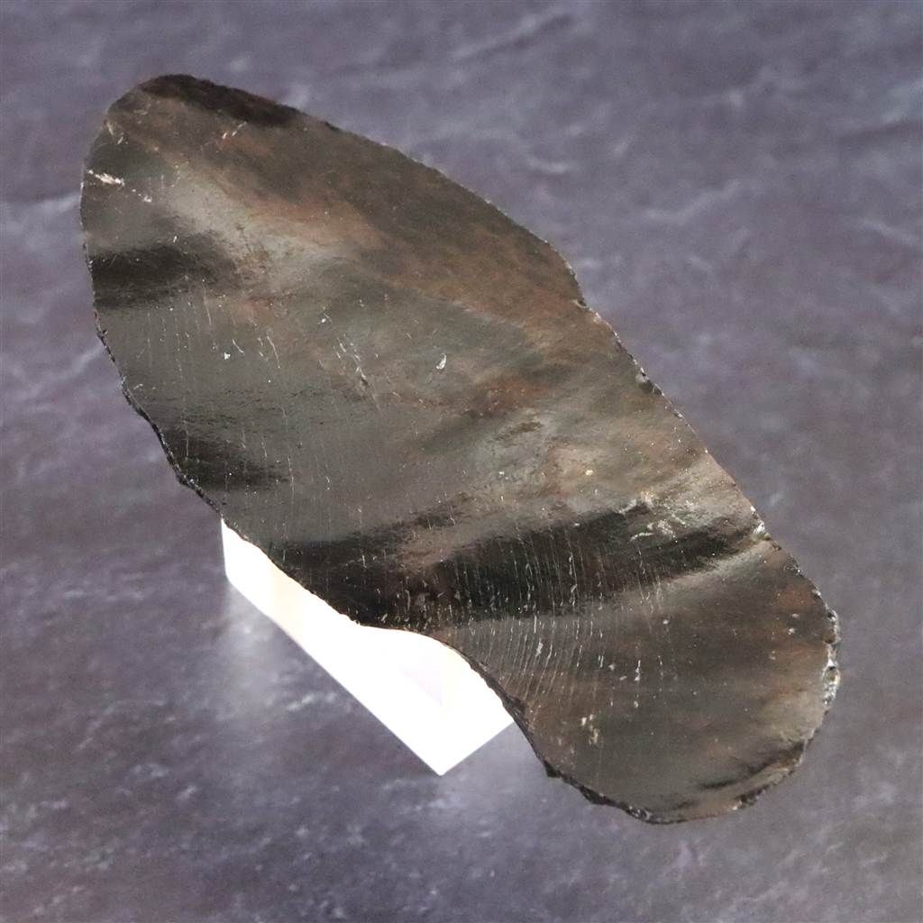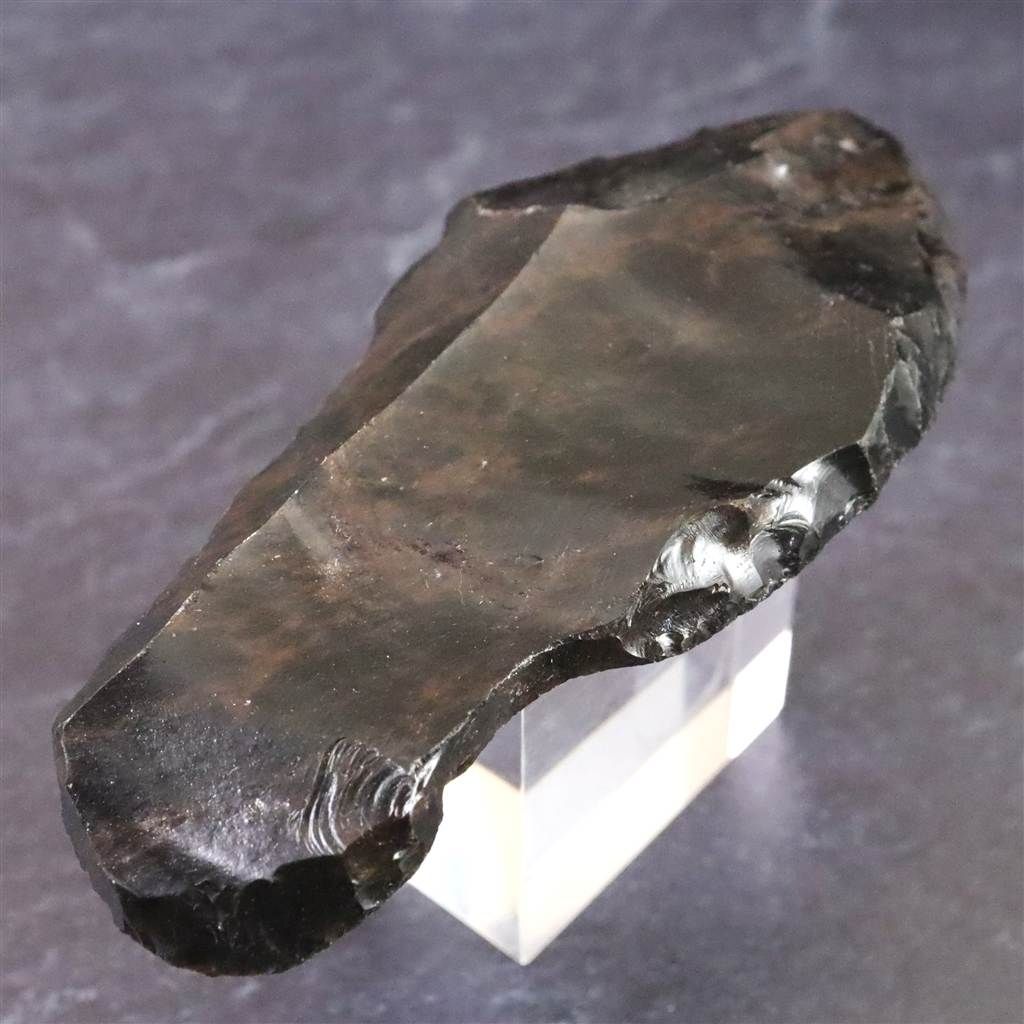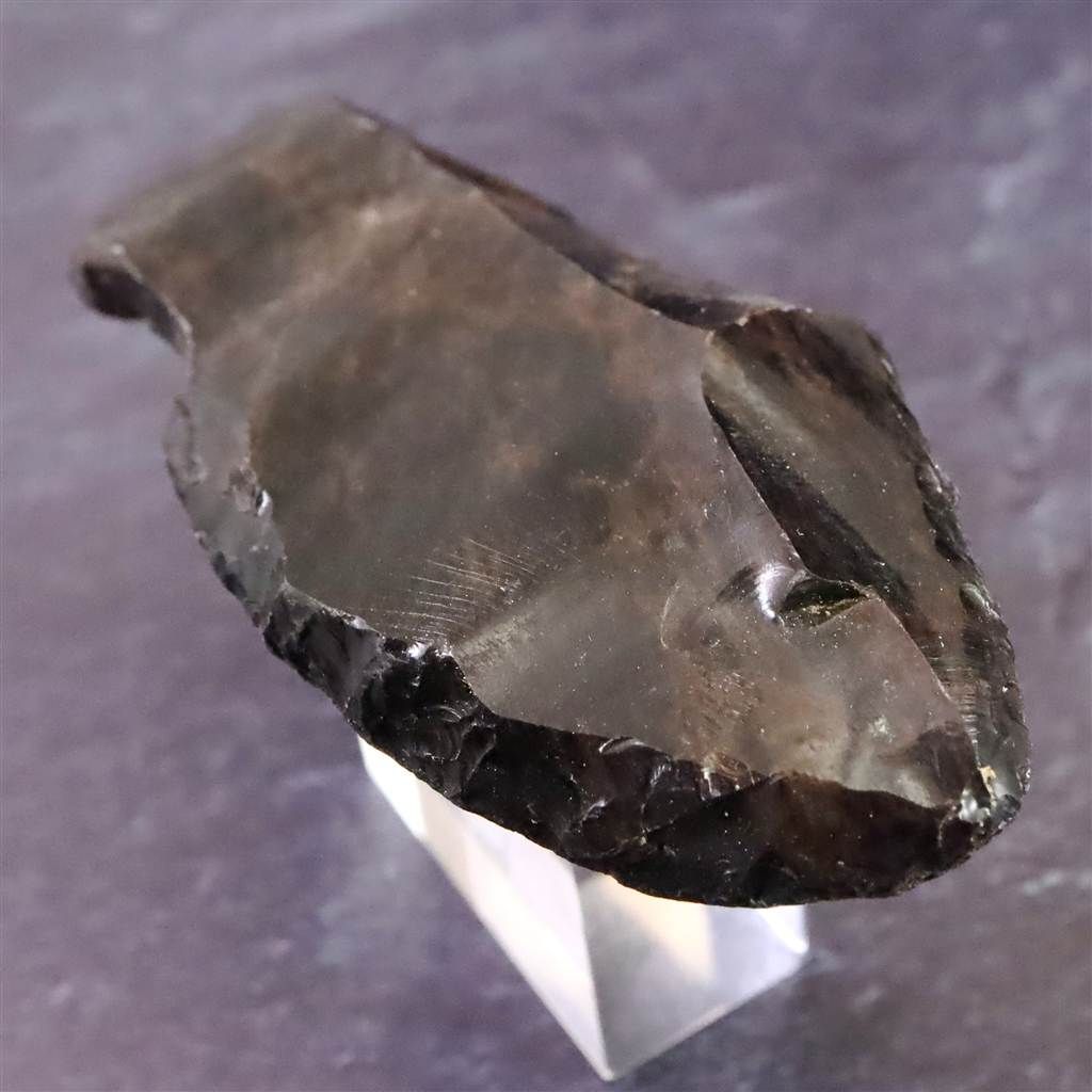 ◆ 本品は、東北・北海道地域にて出土したと伝わる後期旧石器時代(約3万8千~1万6千年前)に作られたと考えられる打製石器です。火山活動によって生じる黒曜石は、天然ガラス特有の貝殻状の割れ方を示し、鋭い断口を得やすいことから、旧石器時代より石刃製作に適した素材として利用されてきました。本品は、原石から薄い剥片を意図的にはぎ取り、縁部に連続した打ち欠き痕を施して細長い刃状へと整えられたものです。鏡面のように平滑な面と、段差や凹凸が残る打ち欠き面の対比がはっきりしており、剥離の際に生じた湾曲した波紋状の痕跡も確認できます。側縁部には小刻みな調整痕が連続しており、刃部を整形した際の加工工程を観察しやすい点が特徴です。このような石刃は、後期旧石器時代の日本列島各地で確認されており、切断・削りなど実用的な用途に適した形状とされています。黒曜石の石器製作技法を理解するうえで、観察価値の高い一点です。