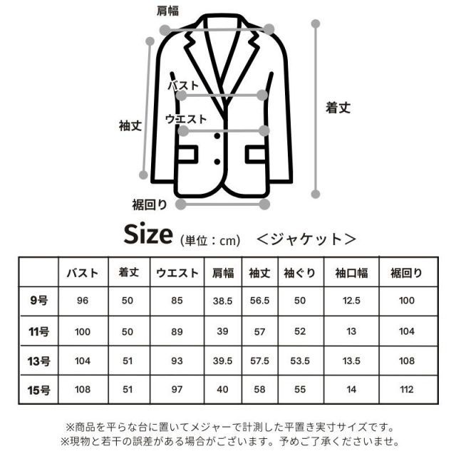仕様■ジャケット:裏地あり・肩パットあり・ポケットあり・前中心ホック3ヶ所留め・袖口スリットあり(約5cm)