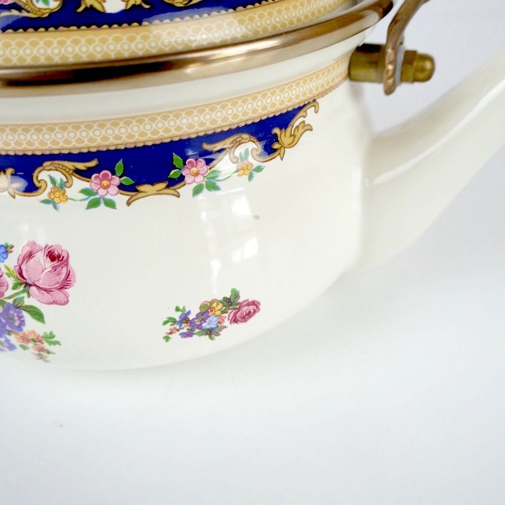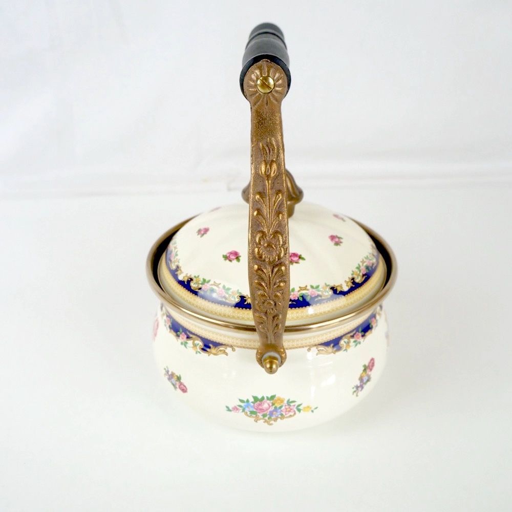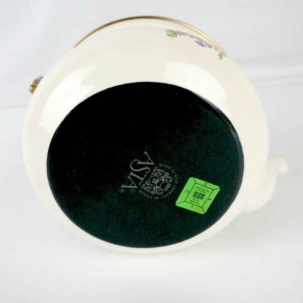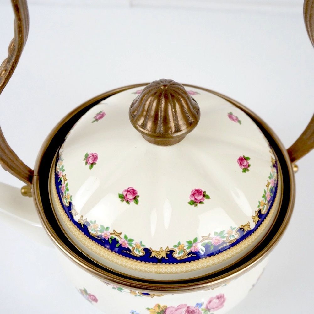 西ドイツ時代のエナメル(ホーロー)ブランド「ASTA」のポットです。厚みのあるホーローとクラシカルな真鍮風ハンドル、花柄デコレーションが印象的。